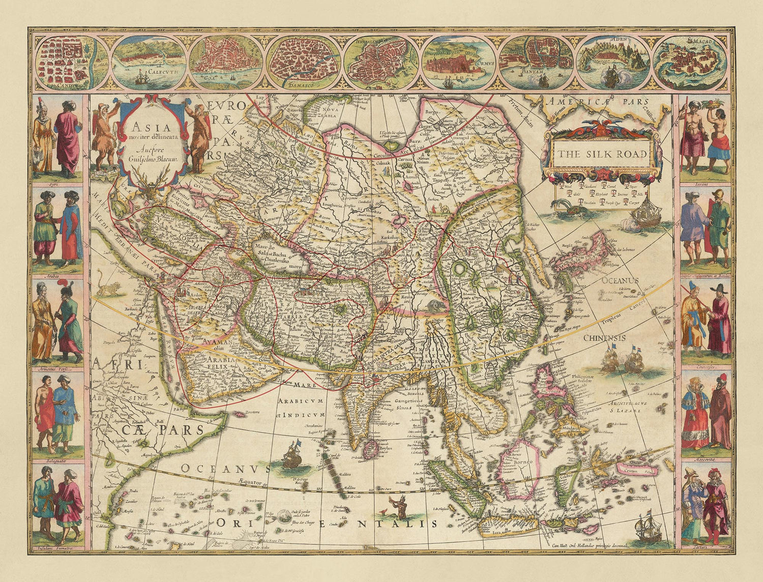 Schreiten Sie in das reiche Geflecht der Geschichte mit dieser exquisiten Karte der Seidenstraße, meisterhaft gestaltet von The Unique Maps Co. im Jahr 2024, basierend auf einer Karte Asiens des renommierten Kartographen Willem Blaeu aus dem Jahr 1640.