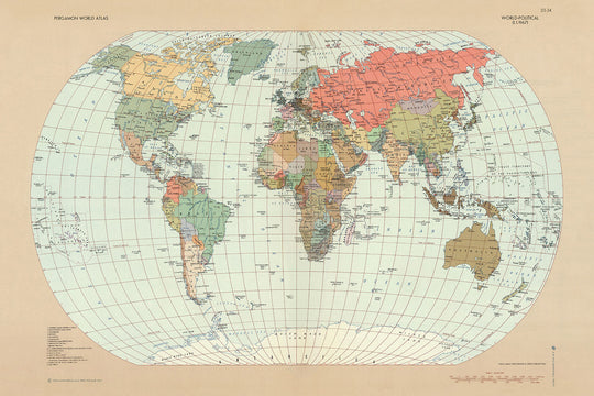 Diese Karte ist ein Fenster zu einem entscheidenden Moment der Geschichte und bietet eine einzigartige Perspektive auf die politische und geografische Landschaft der Welt im Jahr 1967. Egal, ob Sie Sammler, Geschichtsliebhaber oder einfach jemand sind, der schöne Kartografie zu schätzen weiß, diese Karte ist ein bemerkenswertes Stück, das die Vergangenheit mit beispielloser Detailtreue und Kunstfertigkeit zum Leben erweckt.