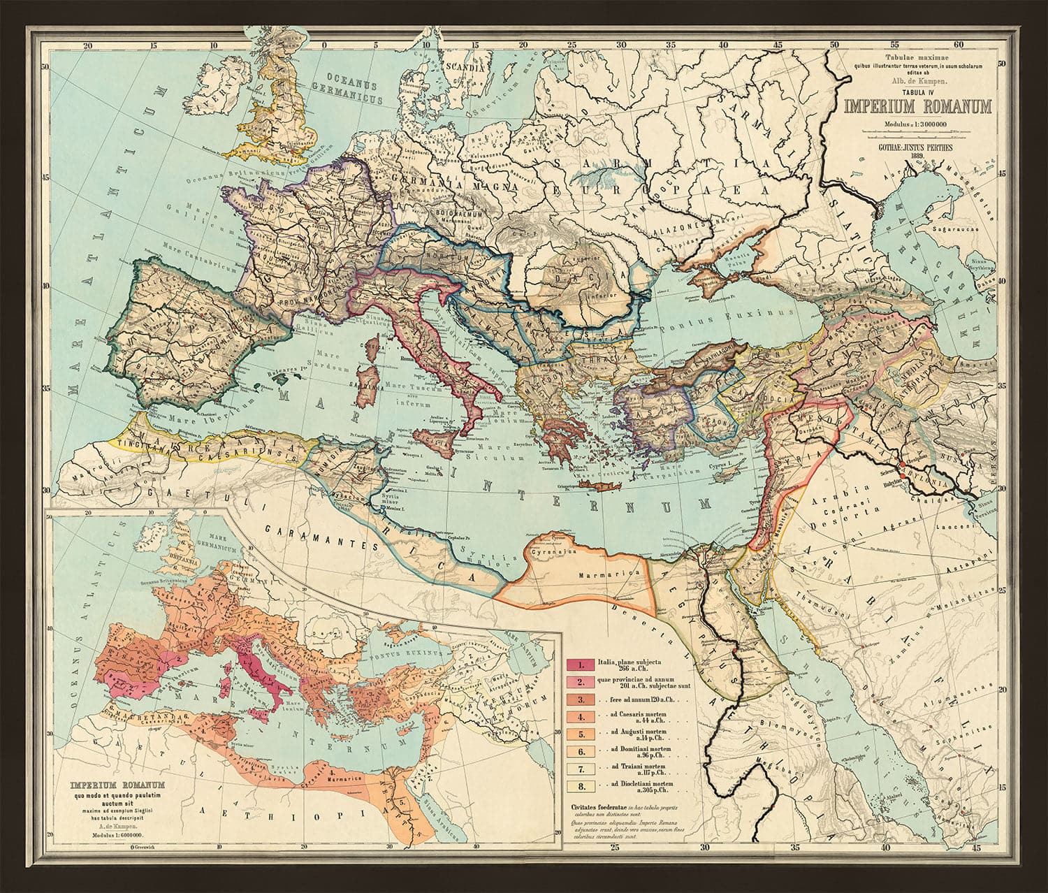 Alte Karte des Römischen Reiches von 266 v. Chr. bis 305 n. Chr. von Perthes & Kampen, 1889: Seltene Karte des Byzantinischen, West- und Ost-Römischen Reiches & Straßen