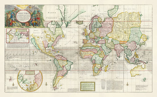 In der oberen Linke links ist eine kleine Weltkarte mit Kompassvariablenzungen dargestellt. Nach links ist eine azimutale Ansicht des Nordpols, die Entdecker begonnen hatten, zu erkunden. Es gibt eine schön detaillierte Kartusche, die Elemente sowohl der alten als auch der neuen Welten zeigt.