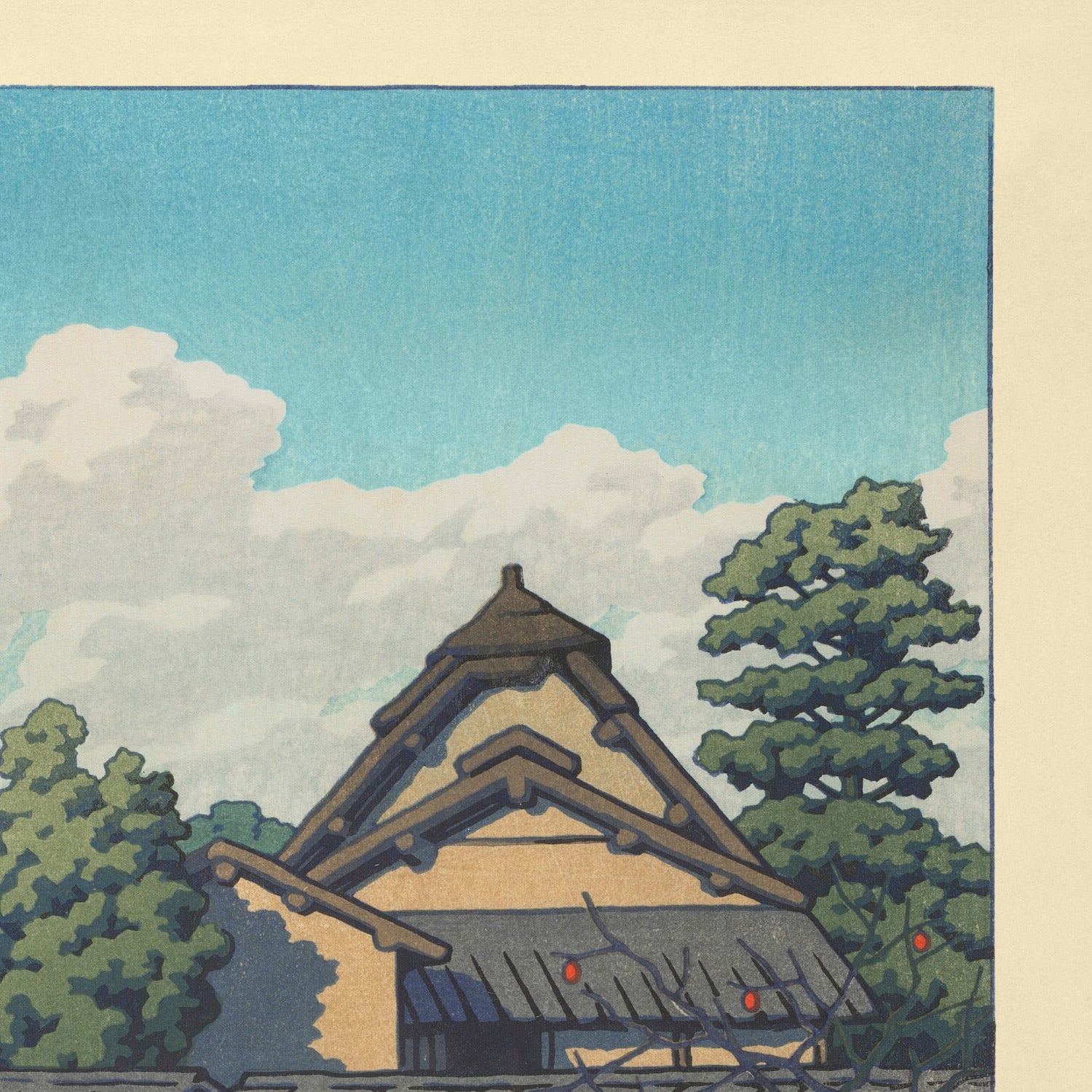 Hasui Kawase ist bekannt für seine Arbeiten zu Beginn des 20. Jahrhunderts als Teil der Shin-Hanga-Kunstbewegung, die die traditionellen Ukiyo-e (schwebende Welt) Drucke für ein zeitgenössisches Publikum revitalisierte. Der "Horyuji-Tempel Westdorf" zeigt seine charakteristische Fähigkeit, traditionelle japanische Kunst mit modernen Empfindungen zu verbinden. Das Werk ist bemerkenswert für seine friedliche Darstellung einer ländlichen Tempelszene, die ruhige Farben und eine reiche Detailtiefe verwendet, die sowohl zur Reflexion als auch zur Bewunderung einladen.