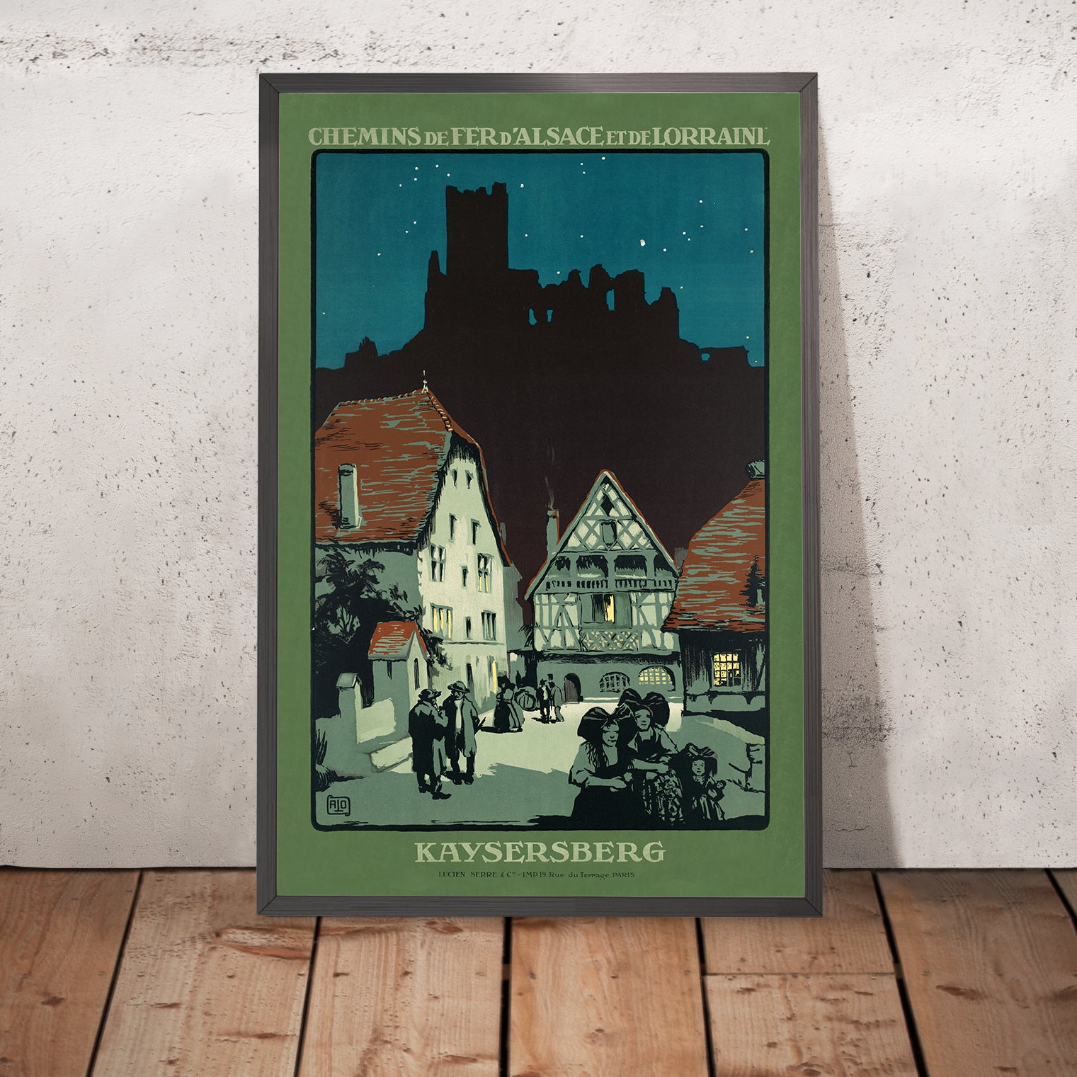 Kaysersberg is celebrated here in an antique travel poster from the Art Nouveau era by an unknown artist, created to entice rail travelers to the heart of Alsace. The composition leads your eye up a medieval street toward hilltop ruins, with timber-framed houses and a silhouetted castle setting the scene for an evening in this picturesque wine-town. Crafted in the flowing, nature-inspired idiom of fin-de-siècle design, the poster captures the romance of regional travel at a moment when Alsace’s cultural identity was a subject of revived pride and curiosity.