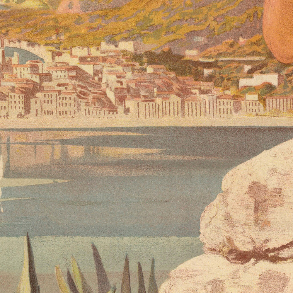 P.L.M. Paris–Lyon–Méditerranée: Menton à 17 h 1/2 de Paris et à 11 minutes de Monte‑Carlo by Frédéric Hugo d’Alesi (1898) captures the French Riviera at the height of the Belle Époque travel boom. Designed to entice modern rail passengers to the sun‑kissed edge of France, this luminous poster pairs an idyllic coastal vista with a proud local figure bearing a basket of lemons—an emblem of Menton’s famed microclimate and citrus heritage. Alesi’s poetic typography highlights how swiftly the PLM railway could deliver travelers to this Mediterranean haven, underscoring Menton’s closeness to Monte‑Carlo and its glamour.