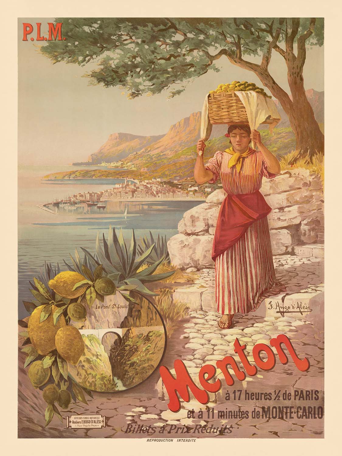 Menton Travel Poster: PLM Menton—17½ Hours from Paris, 11 Minutes from Monte‑Carlo by Frédéric Hugo d’Alesi, 1898