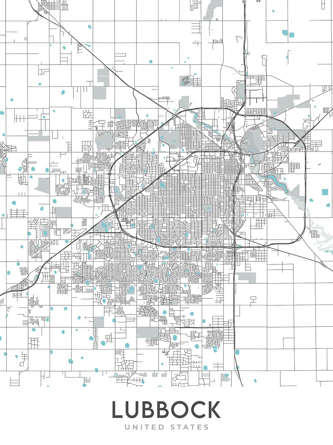 Diese Karte von Lubbock, Texas, ist eine moderne, detaillierte Straßenkarte ohne Beschriftungen, die sich auf die einzigartige Stadtlandschaft der Stadt konzentriert. Die Karte deckt ein großes Gebiet von Lubbock ab, einschließlich einer Vielzahl von Stadtteilen, Hauptstraßen und Sehenswürdigkeiten.