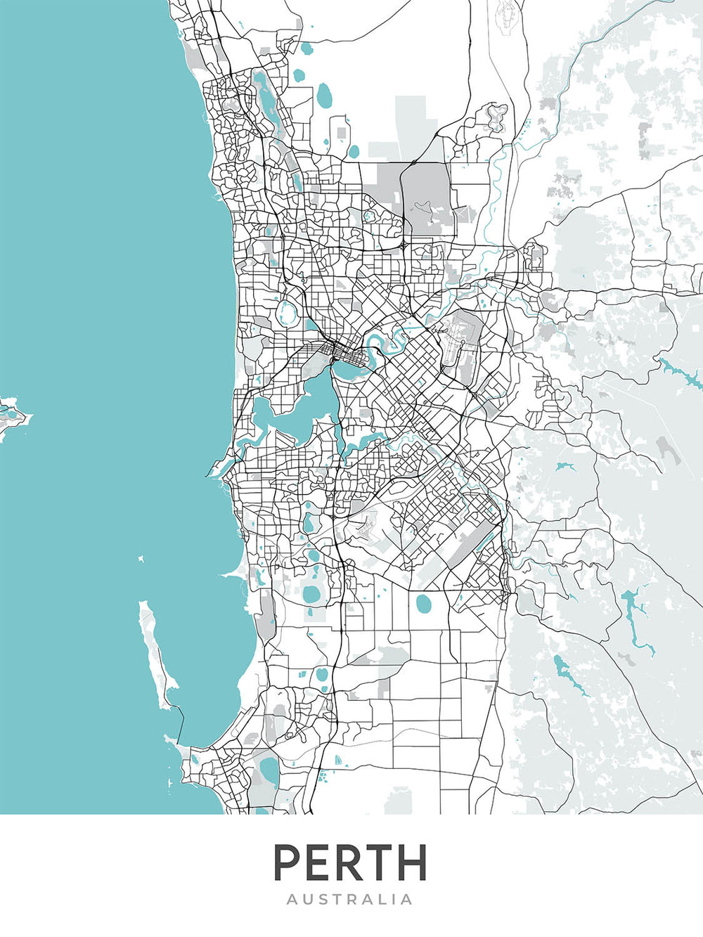 Diese Karte von Perth ist ein modernes und detailliertes kartografisches Kunstwerk, das sich auf die Zersiedelung des Stadtzentrums und seiner umliegenden Vororte konzentriert. Die Karte ist auf das zentrale Geschäftsviertel (CBD) zentriert, in dem sich viele der berühmtesten Wahrzeichen der Stadt befinden, darunter das Perth CBD, Kings Park und Botanic Garden sowie die University of Western Australia. Das CBD ist auch ein wichtiger Verkehrsknotenpunkt, da sich innerhalb seiner Grenzen mehrere Bahnhöfe und Bushaltestellen befinden.