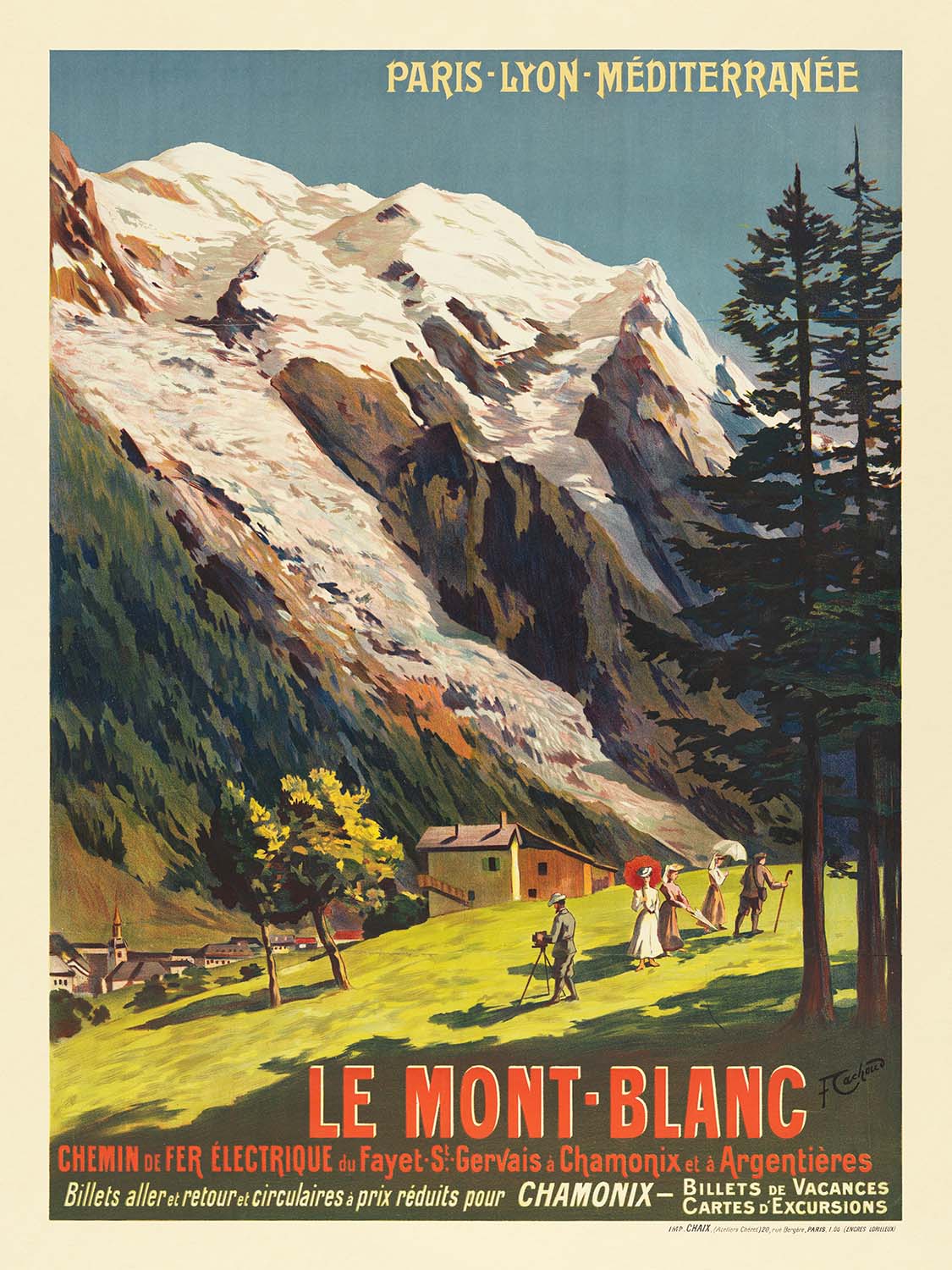 François Cachoud (1866–1943) was a French painter from the Savoy region, long admired for his atmospheric alpine landscapes and moonlit “nocturnes.” Trained in the traditions of fine painting yet keenly attuned to the graphic clarity required for posters, he brought a painter’s sensitivity to commercial art. His collaboration with the PLM Railway positioned him at the intersection of art and modern mobility, and his alpine scenes remain prized for their lyrical handling of light and contour.
