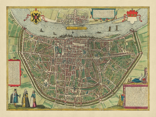 Zusammenfassend ist Georg Brauns "Colonia Agrippina" nicht nur eine Karte, sondern ein historisches Artefakt, das die Seele Kölns im 16. Jahrhundert einfängt. Ihre künstlerischen Details, kombiniert mit der Tiefe historischer Einblicke, machen sie zu einer unvergleichlichen Darstellung der architektonischen, politischen und spirituellen Landschaft der Stadt. Für diejenigen, die die Schönheit der Kartografie und das reiche Gewebe der Geschichte schätzen, ist diese Karte ein Schatz, der einen Blick in die Vergangenheit bietet und die Betrachter einlädt, die geschichtsträchtigen Straßen und Wahrzeichen Kölns zu erkunden, wie sie vor über vier Jahrhunderten waren.