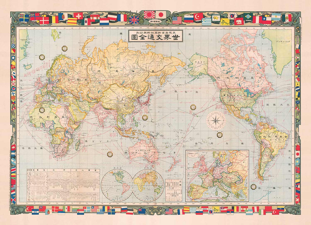 Die Karte ist sehr detailliert, einschließlich der internationalen Schifffahrtsrouten und der nationalen und transkontinentalen Eisenbahnlinien. Am Rande der Karte sind die Flaggen der meisten großen Nationen der Welt abgebildet.