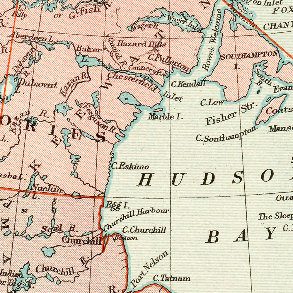 Diese Karte ist nicht nur eine Darstellung politischer Grenzen; sie ist ein Fenster in das geografische und kulturelle Gefüge von Kanada und Neufundland. Die Karte umreißt elegant die Provinzen, geschmückt mit Eisenbahnen und Entwässerungssystemen, die die Geschichte einer Nation in Bewegung erzählen. Gewässer wie die Hudsonbucht und der Atlantische Ozean sind wunderschön dargestellt und vermitteln ein Gefühl für die umfangreichen natürlichen Ressourcen, die die Geschichte der Region geprägt haben. Die Einbeziehung von Längen- und Breitengraden sowie einer Maßstabsleiste in englischen Meilen gewährleistet eine präzise geografische Orientierung und macht sie sowohl zu einem funktionalen als auch zu einem dekorativen Stück.