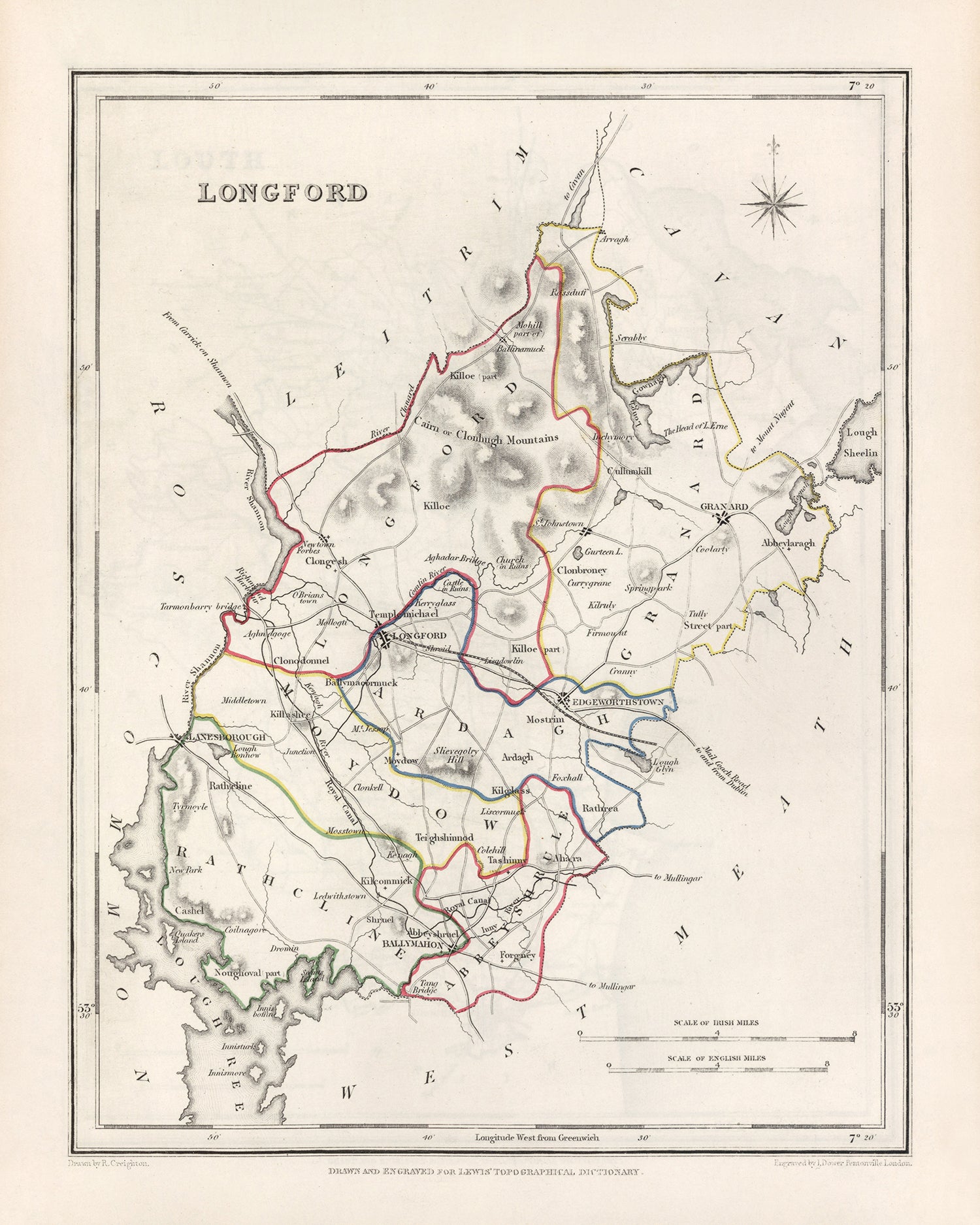 Alte Karte des County Longford von Samuel Lewis, 1844: Ballymahon, Edgeworthstown, Granard, Abbeyshrule, Fluss Shannon