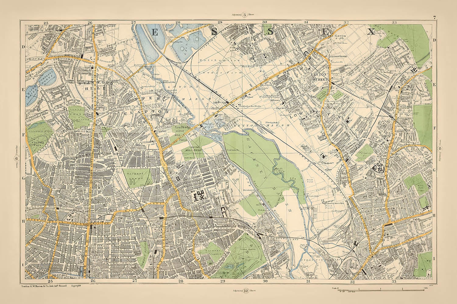 Die Karte ist ein Zeugnis für Londons dynamische Evolution und zeigt bedeutende Wahrzeichen wie die Lea Bridge und die weitläufigen Hackney Downs. Diese Gebiete, die heute dicht besiedelt sind, waren einst mit offenen Flächen und aufstrebender Infrastruktur gespickt. Die Karte veranschaulicht auf wunderschöne Weise den Kontrast zwischen viktorianischen Wahrzeichen und den weiten landwirtschaftlichen Flächen, die auf eine Entwicklung warteten, und bietet einen einzigartigen Einblick in die Vergangenheit der Stadt und ihren Weg zur Modernisierung.