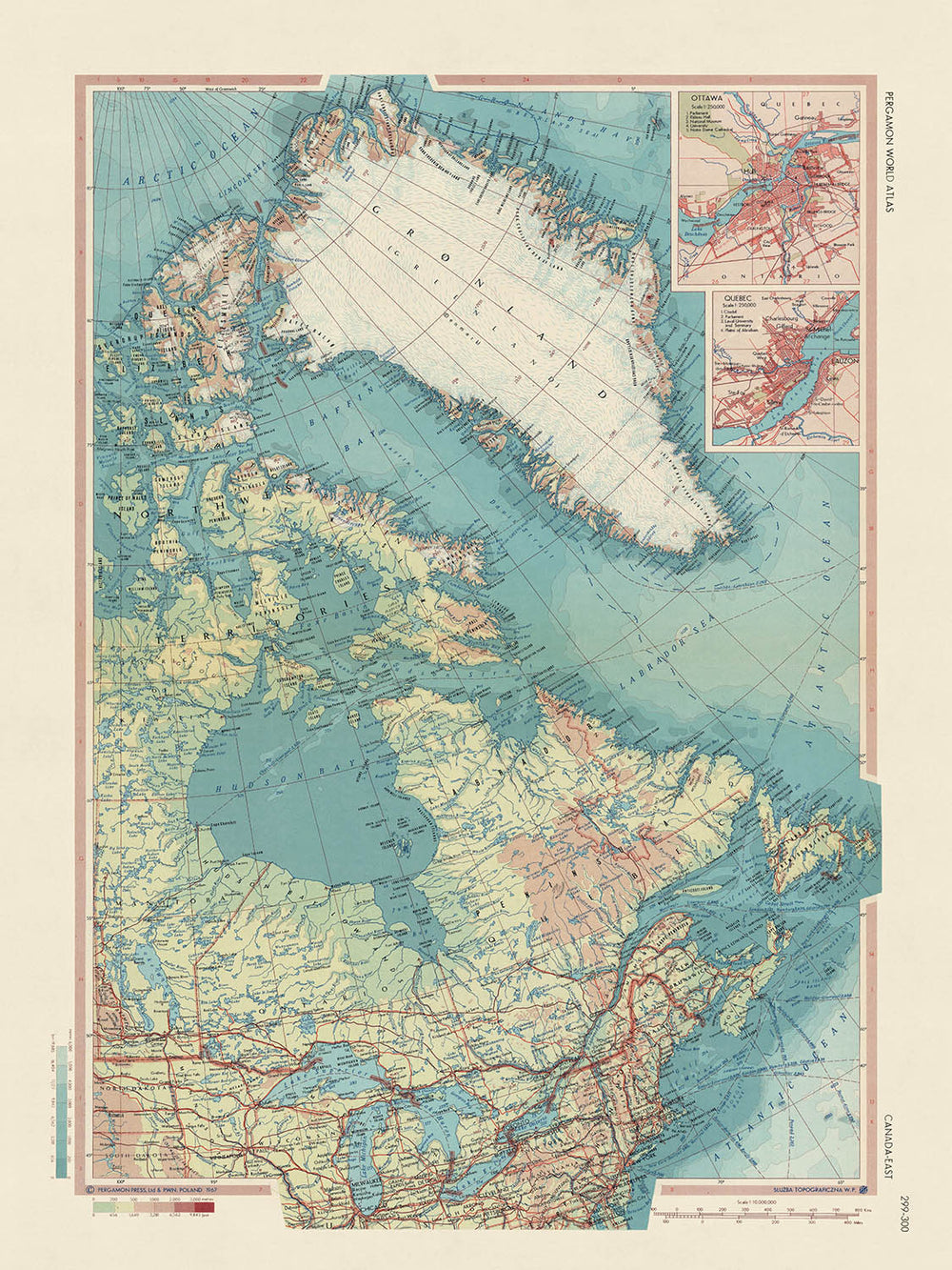 Alte Karte von Ostkanada, 1967: Ontario, Grönland, Neufundland, Labrador, Detaillierter politischer und physischer Atlas