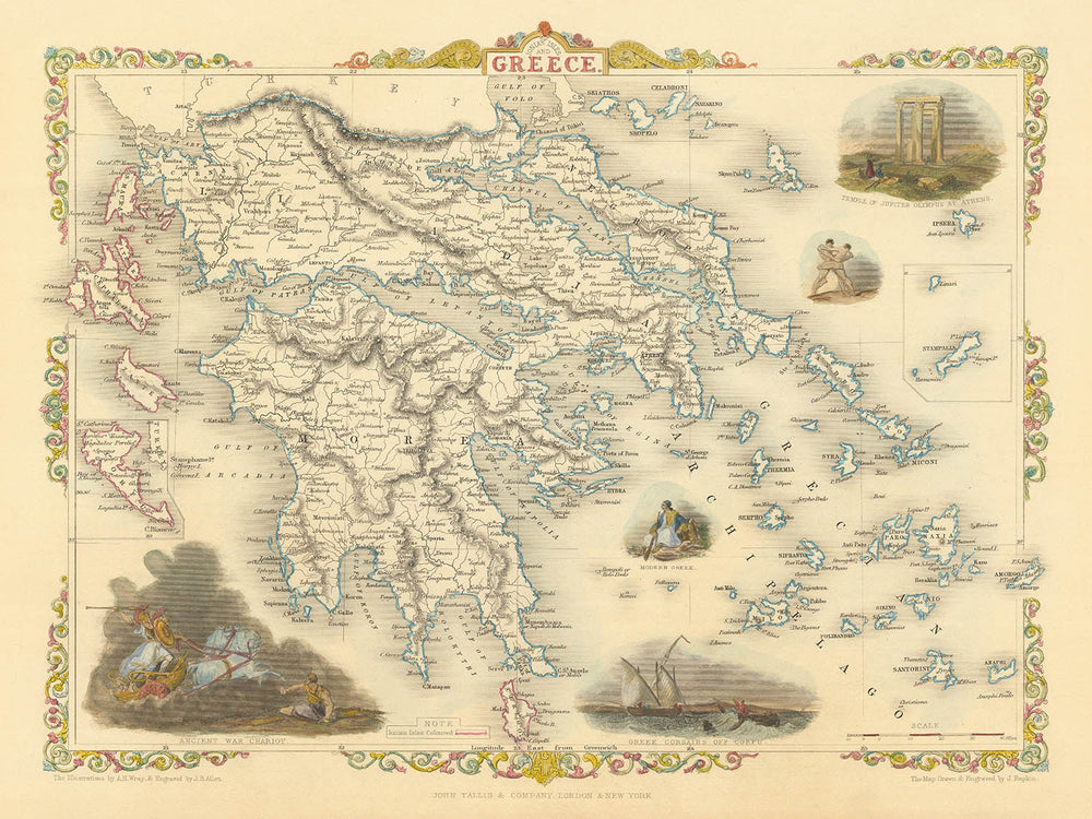 John Tallis, ein Lichtgestalt in der Welt der dekorativen Kartographie, bringt seinen charakteristischen Stil in diese Karte ein und verbindet künstlerische Eleganz mit präzisen geografischen Details. Bekannt durch seine Arbeit mit R. Montgomery Martins illustriertem Atlas, sind Tallis' Karten für ihre ästhetische Anziehungskraft und historische Tiefe gefeiert. Seine Darstellung Griechenlands und der Ionischen Inseln ist keine Ausnahme und zeigt eindrucksvolle Vignetten, die Einblicke in das kulturelle und historische Wesen der Region bieten. Von antiken Kriegswagen bis zu Szenen griechischer Korsaren, die nahe Korfu navigieren, bereichert jede Illustration das Verständnis des Betrachters für die lebendige Vergangenheit der Gegend.