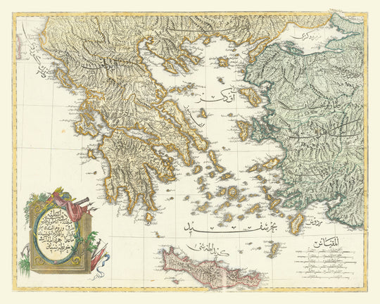 Alte arabische Karte von Griechenland und der Türkei, Raif Efendi, 1803: Athen, Kreta, die Kykladen, die Ionischen Inseln und die Peloponnes