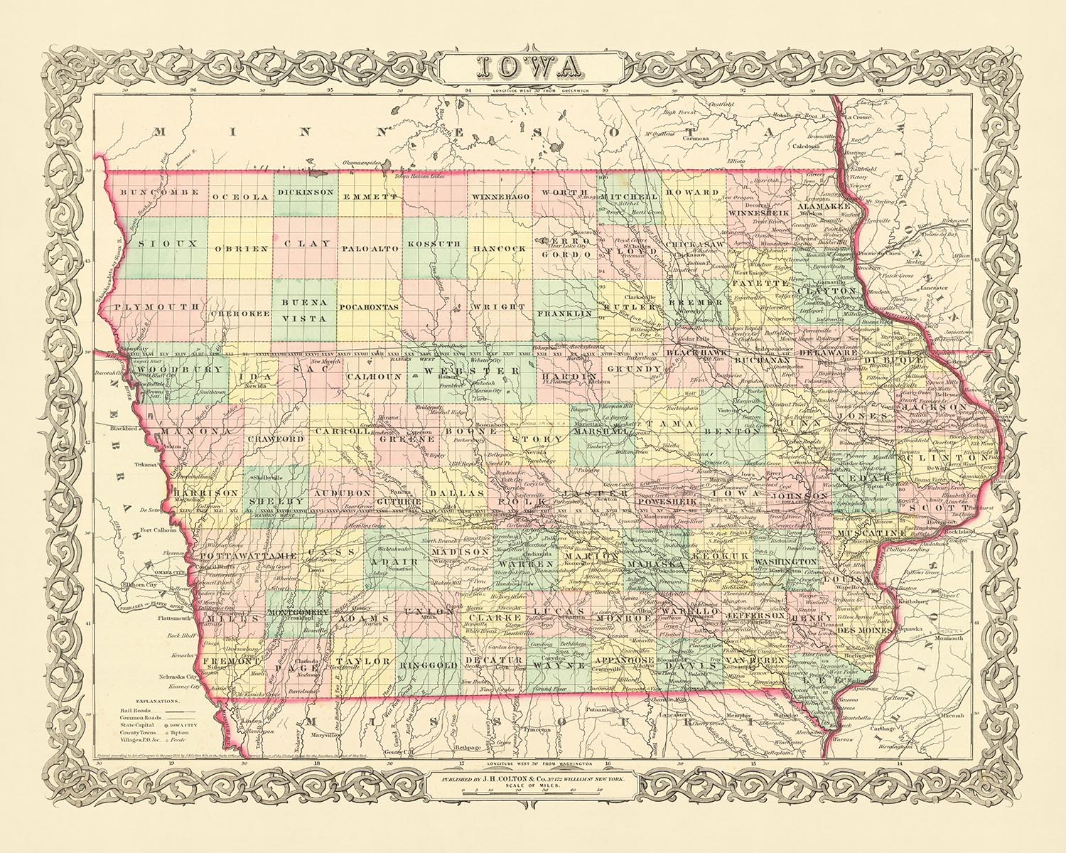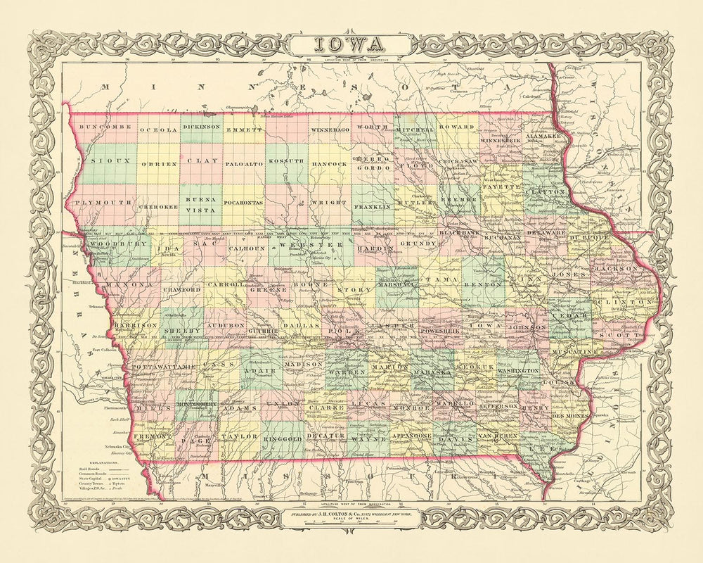 Tauchen Sie ein in die reiche Geschichte der Vereinigten Staaten mit dieser sorgfältig gestalteten alten Karte von Iowa aus dem Jahr 1856, herausgegeben vom angesehenen Kartenmacher JH Colton. Dieses Stück bietet einen einzigartigen Einblick in die Vergangenheit des Landes, zu einer Zeit, als viele Siedlungen noch in den Kinderschuhen steckten und die Grenzen und Namen, die wir heute kennen, sich noch im Entstehen befanden. Diese Karte ist ein Zeugnis der dynamischen Geschichte des Landes und bietet eine Momentaufnahme einer Zeit, die in die Annalen der amerikanischen Geschichte eingebrannt ist.