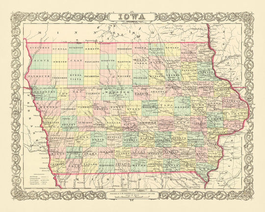 Diese alte Karte von Iowa von JH Colton ist mehr als nur ein historisches Artefakt. Es ist ein Kunstwerk, ein Fenster in die Vergangenheit und ein Beweis für das Können und die Hingabe eines der besten Kartographen Amerikas. Egal, ob Sie ein Geschichtsinteressierter, ein Sammler oder einfach jemand sind, der feine Handwerkskunst zu schätzen weiß, diese Karte wird mit Sicherheit eine wertvolle Ergänzung Ihrer Sammlung sein.