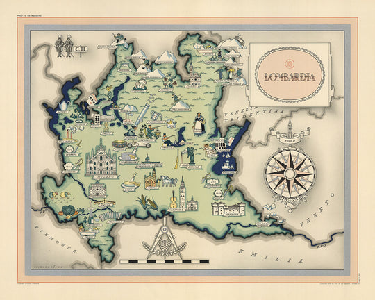 Diese wunderschöne und detaillierte Karte der italienischen Region Lombardei wurde ursprünglich 1938 vom renommierten italienischen Kartographen Giovanni De Agostini veröffentlicht. Es handelt sich um eine thematische und bildliche Karte mit farbenfrohen Vignetten von Strukturen, Natur, Aktivitäten, Produkten, Nutzpflanzen und mehr. Städte und Gemeinden sind deutlich beschriftet und auf der gesamten Karte wurden Silber und Gold verwendet, was zu ihrem luxuriösen Erscheinungsbild beiträgt.
