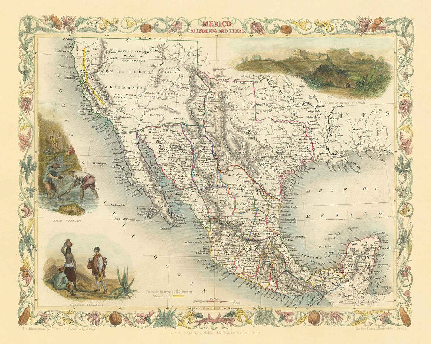 Über ihre politischen und physischen Details hinaus ist die Karte ein visuelles Fest, geschmückt mit Vignetten, die Einblicke in das Leben und die Landschaften der Zeit bieten. Die goldgewaschene Szene in Kalifornien ist ein Hinweis auf den transformativen Einfluss des Goldrausches, während Illustrationen von Yucatan-Ruinen und mexikanischer Landbevölkerung die tiefen kulturellen Wurzeln der Region hervorrufen. Indigene Stämme sind respektvoll im gesamten Südwesten beschriftet, ihre Präsenz eine eindringliche Erinnerung an die ursprünglichen Bewohner des Kontinents. Mit ihrer Mischung aus Kunstfertigkeit, Genauigkeit und historischem Nachhall ist Tallis' Karte sowohl ein Schatz für Sammler als auch ein Fenster in die lebendige, umstrittene Welt Nordamerikas im mittleren 19. Jahrhundert.
