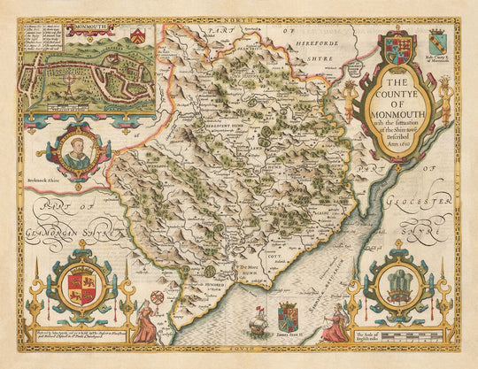 Alte Karte von Monmouthshire, Wales, 1611 von John Speed: Abergavenny, Caldicot, Chepstow, Monmouth, Magor