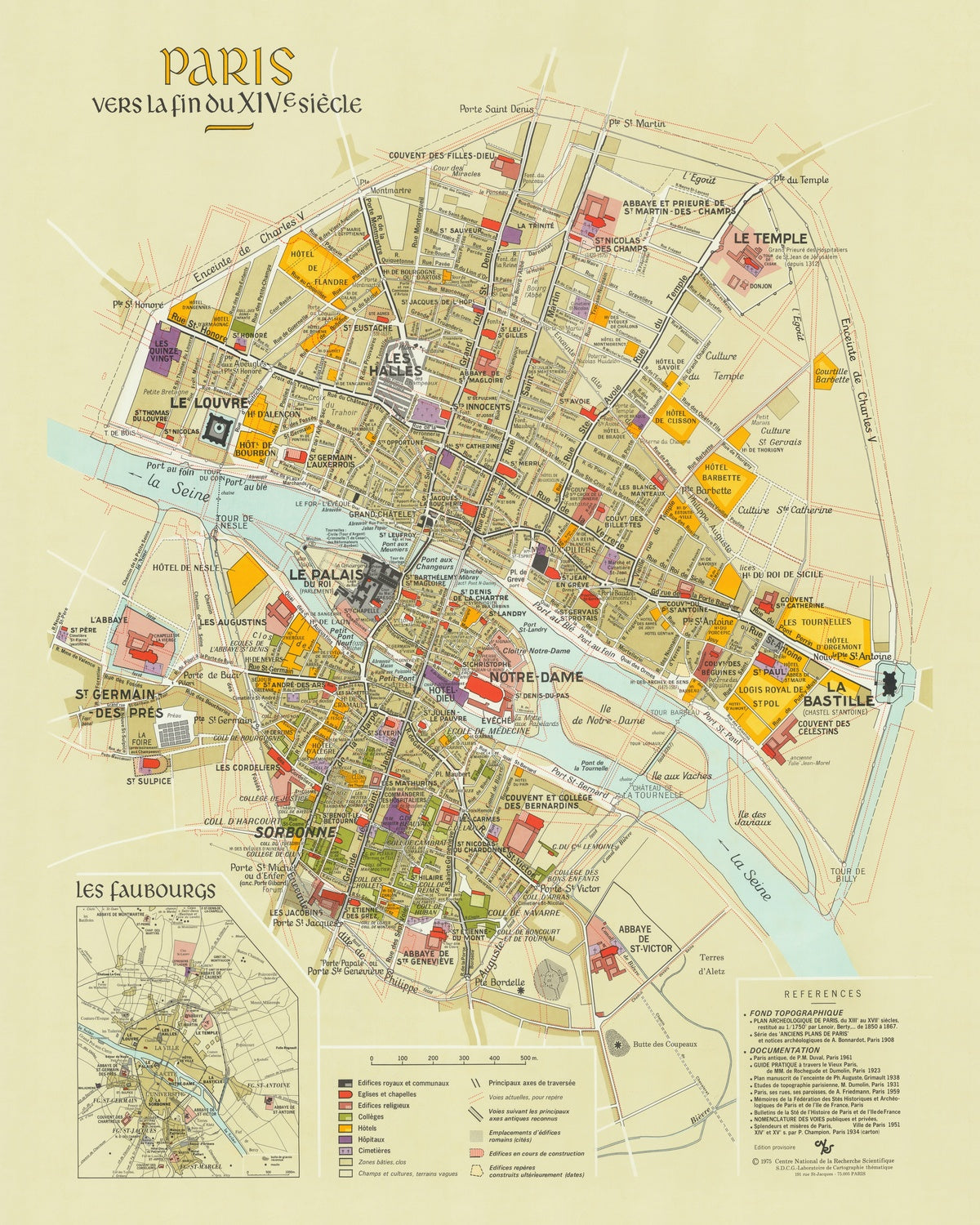 Commissioned by the CNRS in 1975, Paris vers la fin du XIVe siècle is a scholarly reconstruction that unlocks the texture of medieval Paris at a pivotal moment in its history. Its meticulous color-coding and precise symbology distinguish royal, communal, and ecclesiastical domains, while a carefully structured legend anchors every feature in the historical record. What emerges is a city shaped by water, walls, and worship—articulated through topography, street hierarchies, and architectural profiles. Drawing on primary sources to reconcile urban form with documentary evidence, the map captures how Paris evolved through crisis and renewal during the late phases of the Hundred Years’ War, offering collectors and historians alike a vivid, authoritative portrait of Europe’s preeminent medieval metropolis in transition.