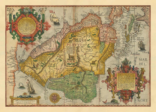 Wie viele Karten der neuen Welt in Europa gibt es fantastische Tiere und imaginäre Orte, Berge und Flüsse um die Karte. Der MapMaker hat sogar einen ganzen Kontinent geschaffen - Terra del Fuego. Dies war sein Versuch, Terra Australis zu zeichnen ... ein mythischer südlicher Kontinent, der noch nicht entdeckt worden war. Zu der Zeit dachten die Menschen, dass dort eine massive Landmasse da sein muss, um das gesamte Land in der nördlichen Hemisphäre auszugleichen.