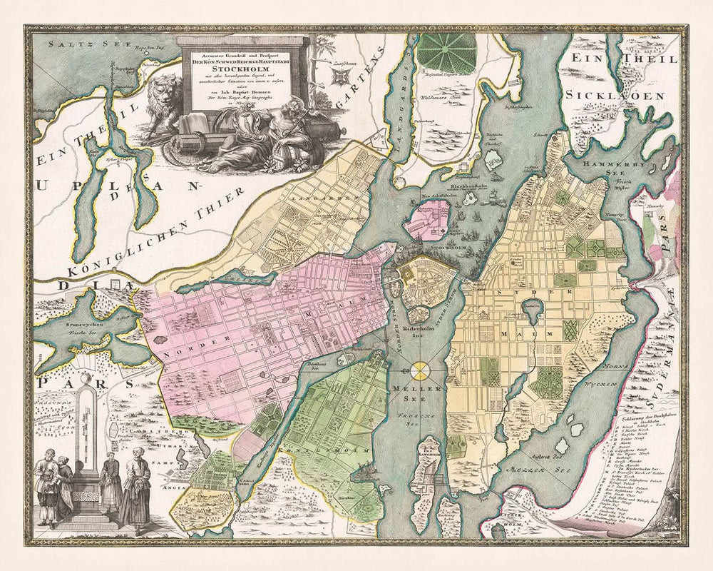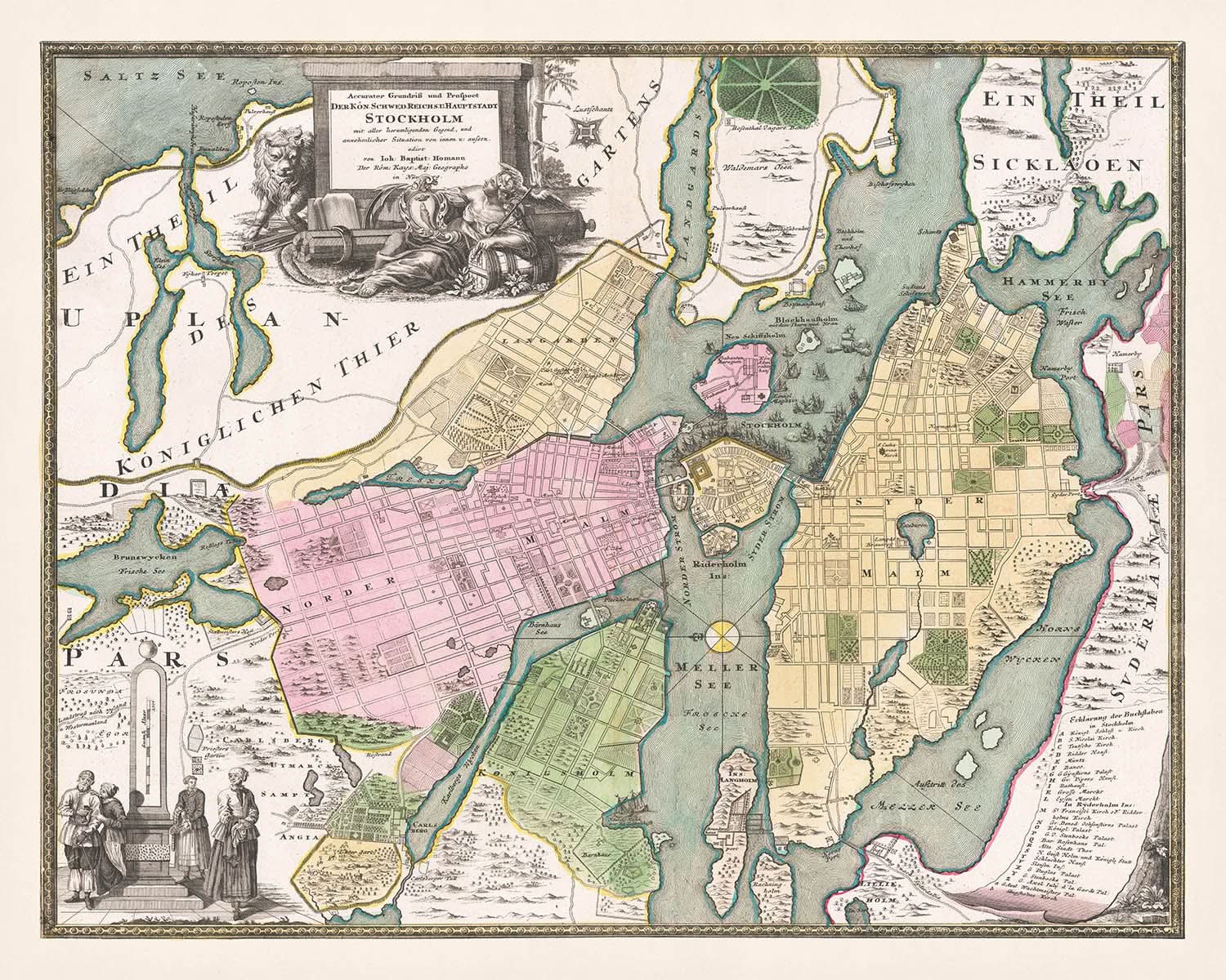 Im Wesentlichen ist diese Karte mehr als nur eine geografische Darstellung; sie ist eine Erzählung der Entwicklung Stockholms, eine Momentaufnahme seiner pulsierenden Vergangenheit. Homanns Werk bleibt für Historiker und Enthusiasten gleichermaßen eine wertvolle Ressource und bietet eine detaillierte Erkundung einer Stadt, die seit langem ein Leuchtturm der Kultur und Innovation ist. Diese Karte ist nicht nur ein Sammlerstück, sondern ein Portal in die Vergangenheit, das den Betrachter einlädt, die Straßen und Geschichten des historischen Stockholms zu durchqueren.