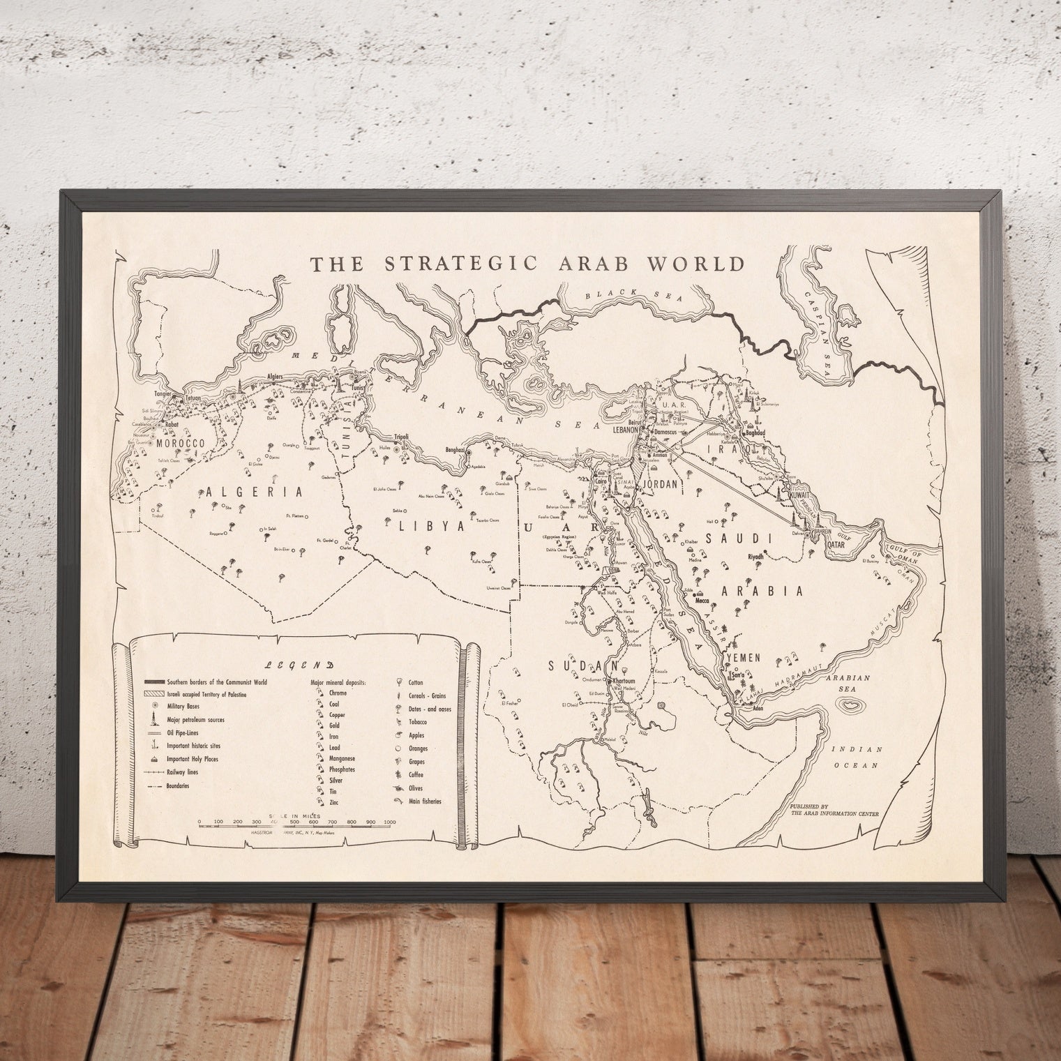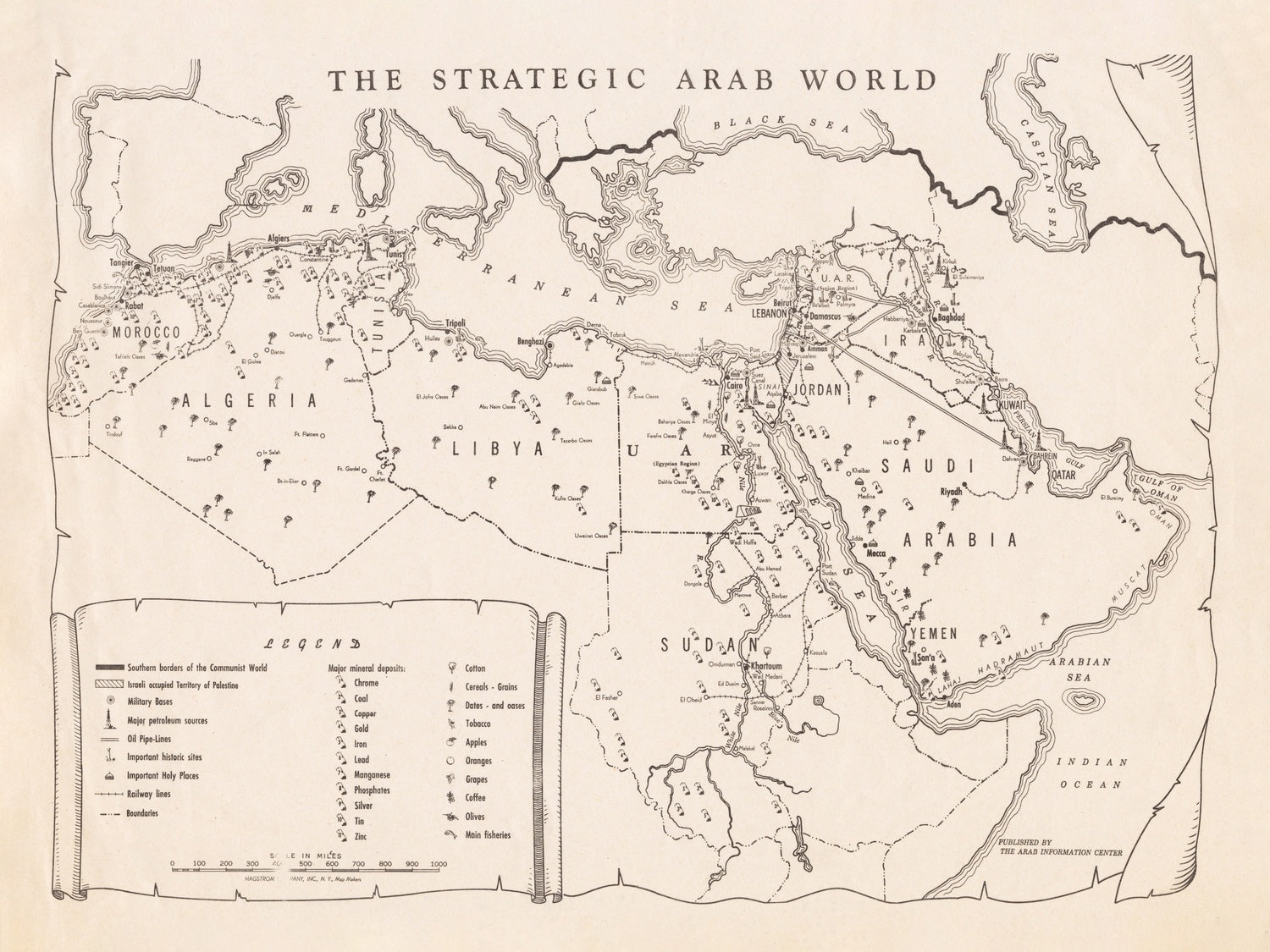 The Strategic Arab World, issued circa 1960 by the Arab Information Center, presents a sweeping, thematic portrait of North Africa and the Middle East at a pivotal moment of postcolonial realignment. From Morocco and Algeria across Libya, Egypt, and Sudan to Jordan, Lebanon, and the Syrian Region of the United Arab Republic, the map arrays the Arab world as a continuous strategic belt from the Mediterranean Sea through the Red Sea and Arabian Sea to the Indian Ocean. Its restrained palette, assertive labels, and tightly organized legend compose a purposeful narrative: economic resources, cultural patrimony, and historic and holy sites are foregrounded, while military installations appear as discreet circles—present, but subordinated. The result is a confident cartographic statement about power, identity, and place.