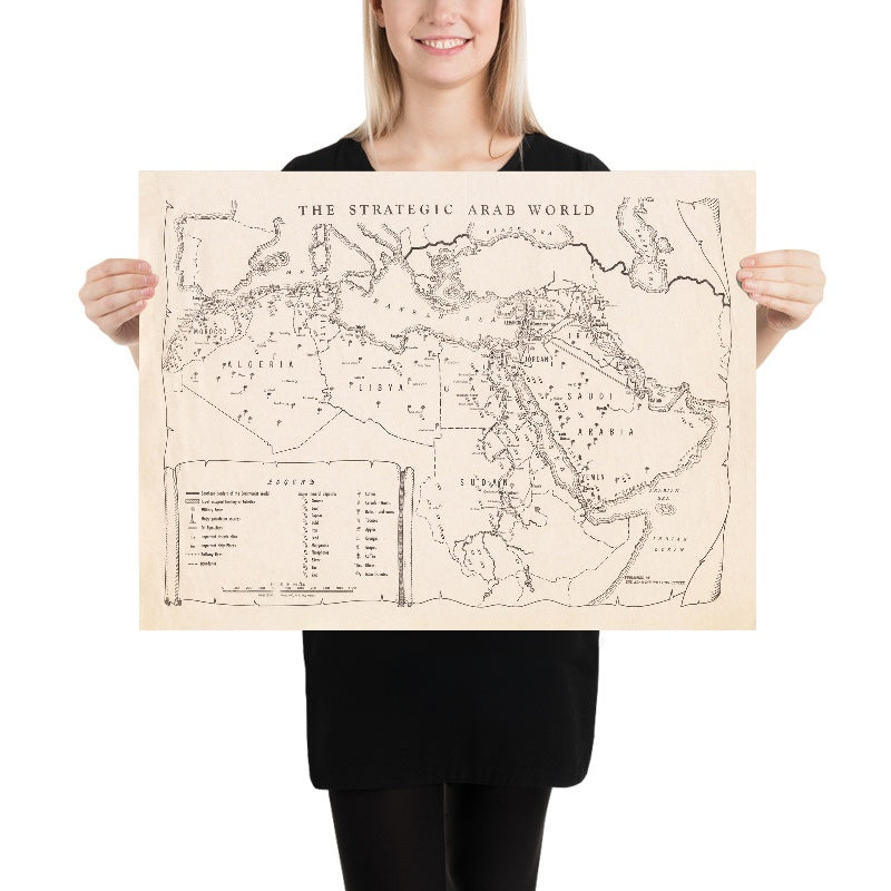 Subtler, yet unmistakable, is the security layer. Small circles quietly indicate military bases, acknowledging the region’s role in Cold War logistics without letting martial symbols dominate the field. Political notes—among them the delineation of Israeli-occupied territories—fix the sheet within its contentious chronology, while the UAR notation captures the high-water mark of pan-Arab aspiration. Encompassing Jordan, Lebanon, Syria (as UAR), Iraq, Saudi Arabia, Yemen, Qatar, Kuwait, Egypt, Sudan, Morocco, Algeria, and Libya, the map positions the Arab world as a hinge between continents and seas. For the collector, it offers a rare synthesis: energy atlas, cultural inventory, and geopolitical self-portrait distilled into a single, serene design.