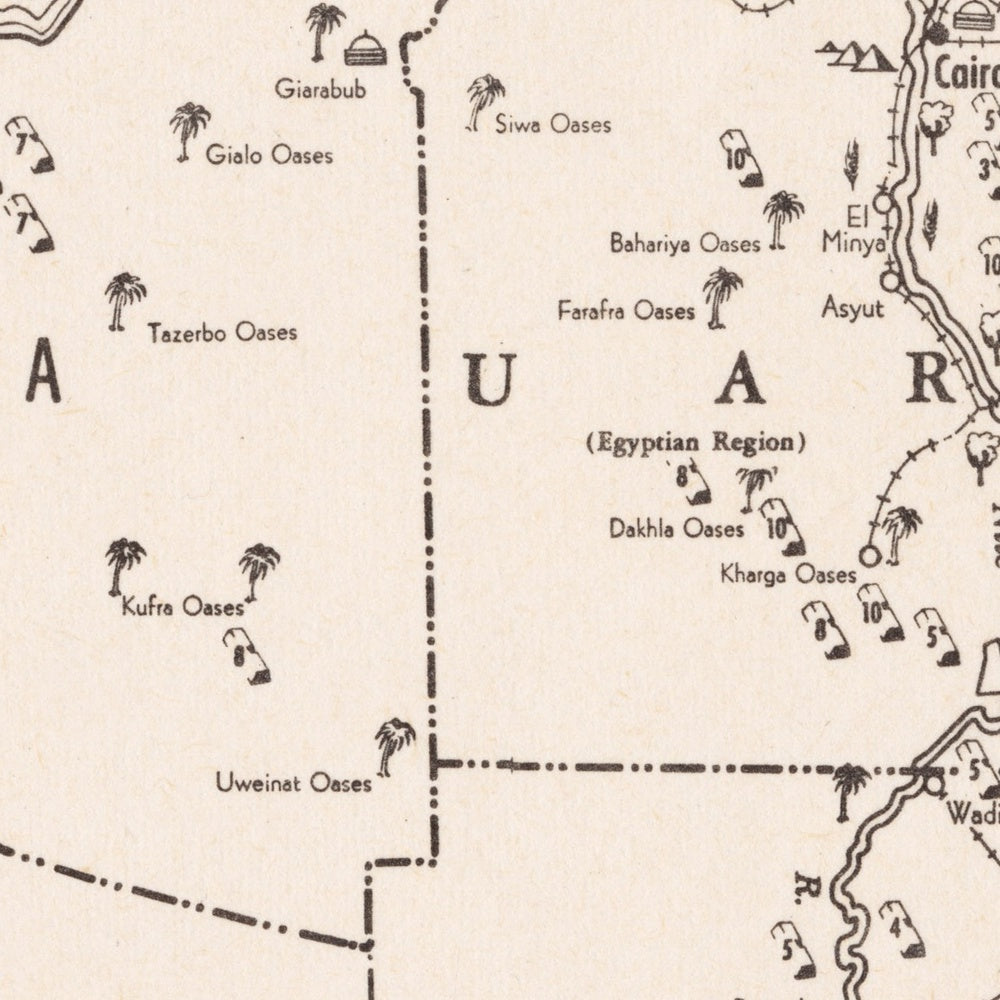 Produced by an institution steeped in mid-century Arab nationalism, the map’s voice is unmistakable yet sophisticated. The Arab Information Center organized its subject matter to project cohesion—an integrated geography of lands, peoples, and assets. The specific labeling of UAR (Syrian Region) fixes the sheet in the Nasser-era orbit and hints at the pan-Arab experiment’s horizons. Borders and captions register the era’s tensions, including lines indicating Israeli-occupied territories, but the visual emphasis lies elsewhere: on resources, cities, and corridors of connection. The design’s minimal color and emblematic symbols create a persuasive clarity that reads as both atlas and argument, turning thematic cartography into a form of diplomacy.