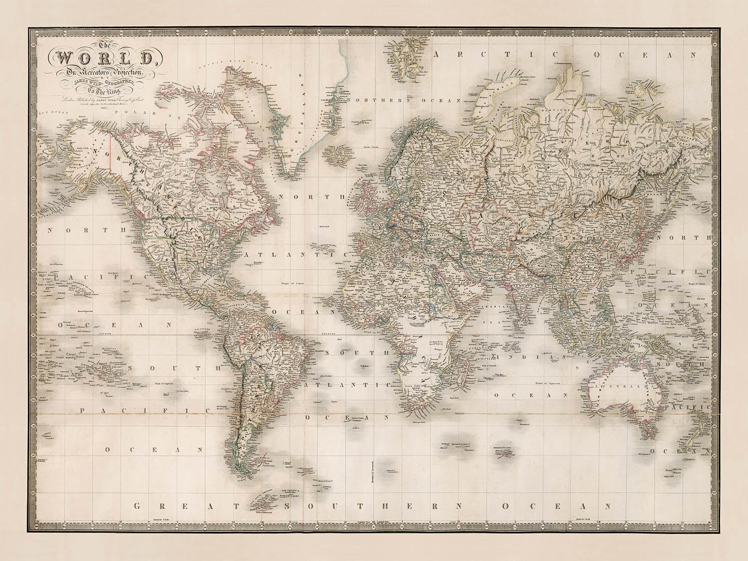 • Description: This is a folded engraved, hand-colored outline map of the world that emphasizes broad geographical outlines while distorting the sizes of Greenland and Antarctica, which appear disproportionately large compared to equatorial land masses. This distortion is characteristic of the Mercator projection.