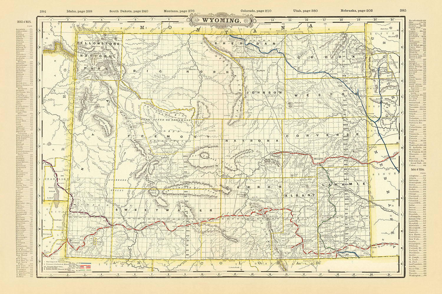 Die Karte zeigt eine Reihe bedeutender Sehenswürdigkeiten und Naturmerkmale, darunter den Wind River oder die Shoshone Indian Range, den Yellowstone-Nationalpark und den Grand-Teton-Nationalpark. Es zeigt auch eine Reihe wichtiger Städte und Gemeinden, darunter Cheyenne, Laramie und Casper. Diese Orte sind alle noch heute wichtig und spielten eine bedeutende Rolle bei der Entwicklung Wyomings.