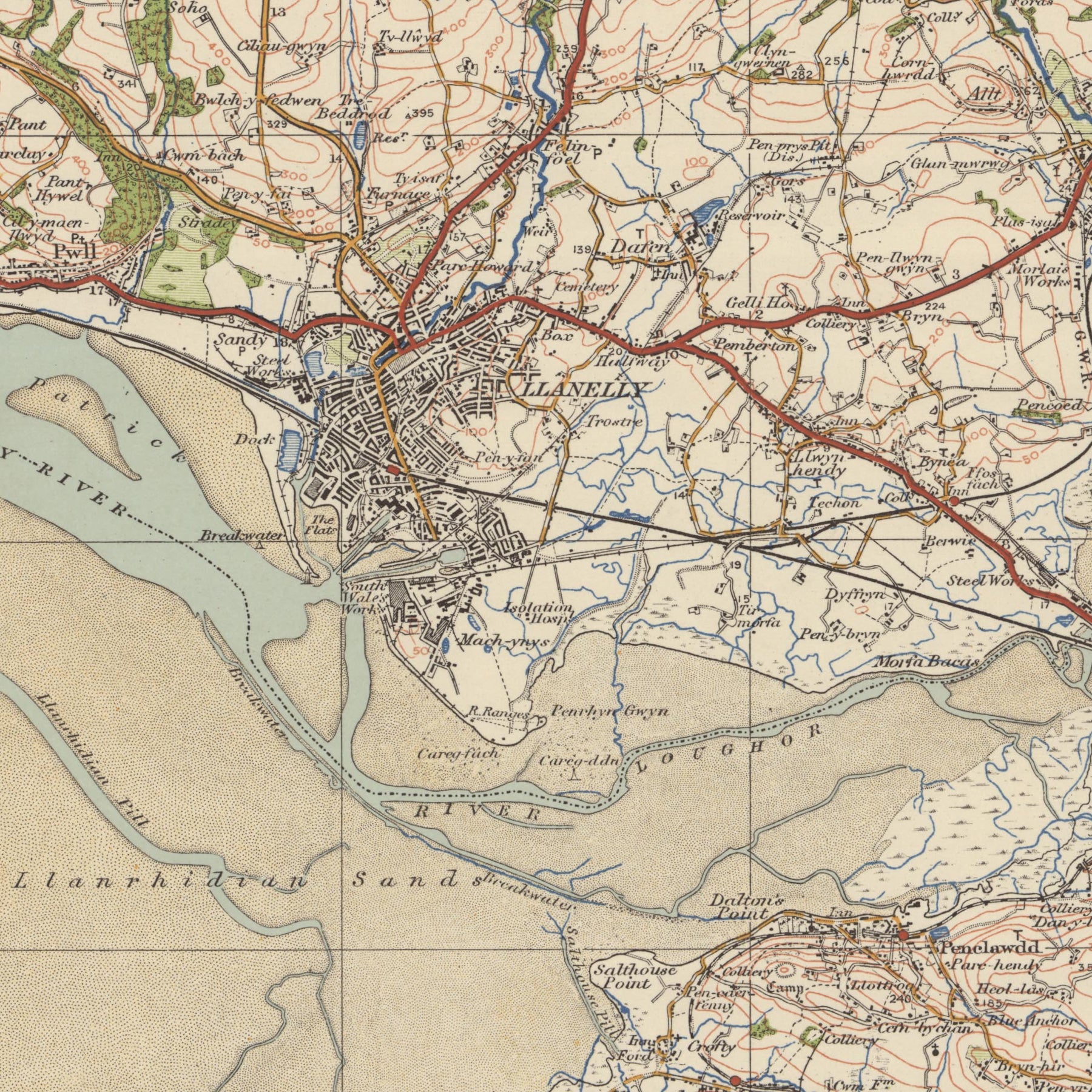 • Llanelly: Der zentrale Standort der Karte, eine wichtige historische Stadt in Carmarthenshire.