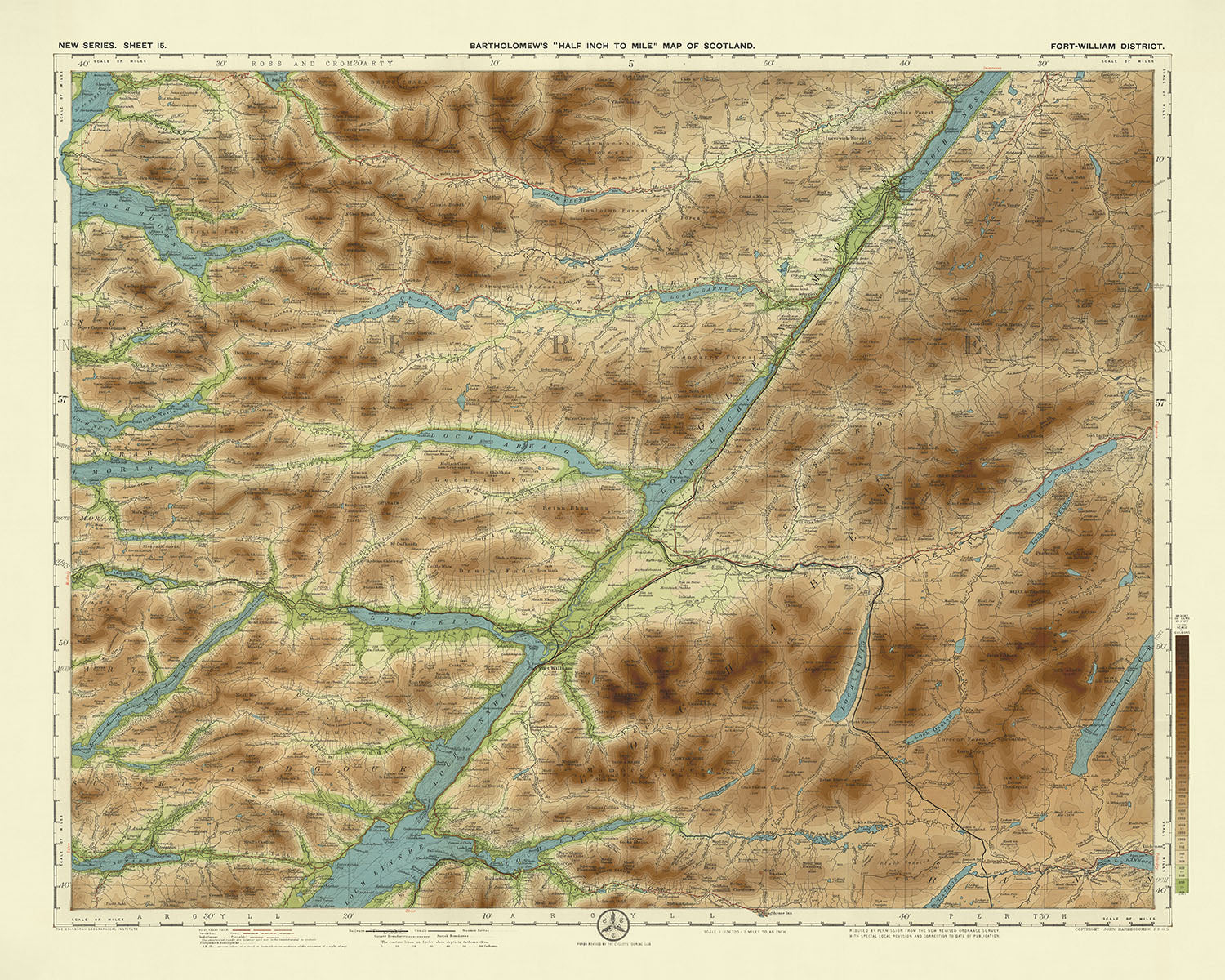 Das Design der Karte ist ein Wunder der kartografischen Innovation, das subtile Farbverläufe nutzt, um das abwechslungsreiche Landschaftsrelief darzustellen. Diese Technik ermöglicht es dem Betrachter, die Höhen und Tiefen der Topografie der Region leicht zu erkennen, von den majestätischen Gipfeln des Ben Nevis und Aonach Mòr bis zu den ruhigen Tälern von Glen Nevis und dem Great Glen. Der sorgfältige Einsatz von Farbbändern schafft einen dreidimensionalen Effekt und erweckt die raue Schönheit der schottischen Highlands zum Leben. Diese Karte basiert auf einer reduzierten Ordnance Survey-Karte aus derselben Zeit, was sowohl Genauigkeit als auch historische Authentizität gewährleistet.