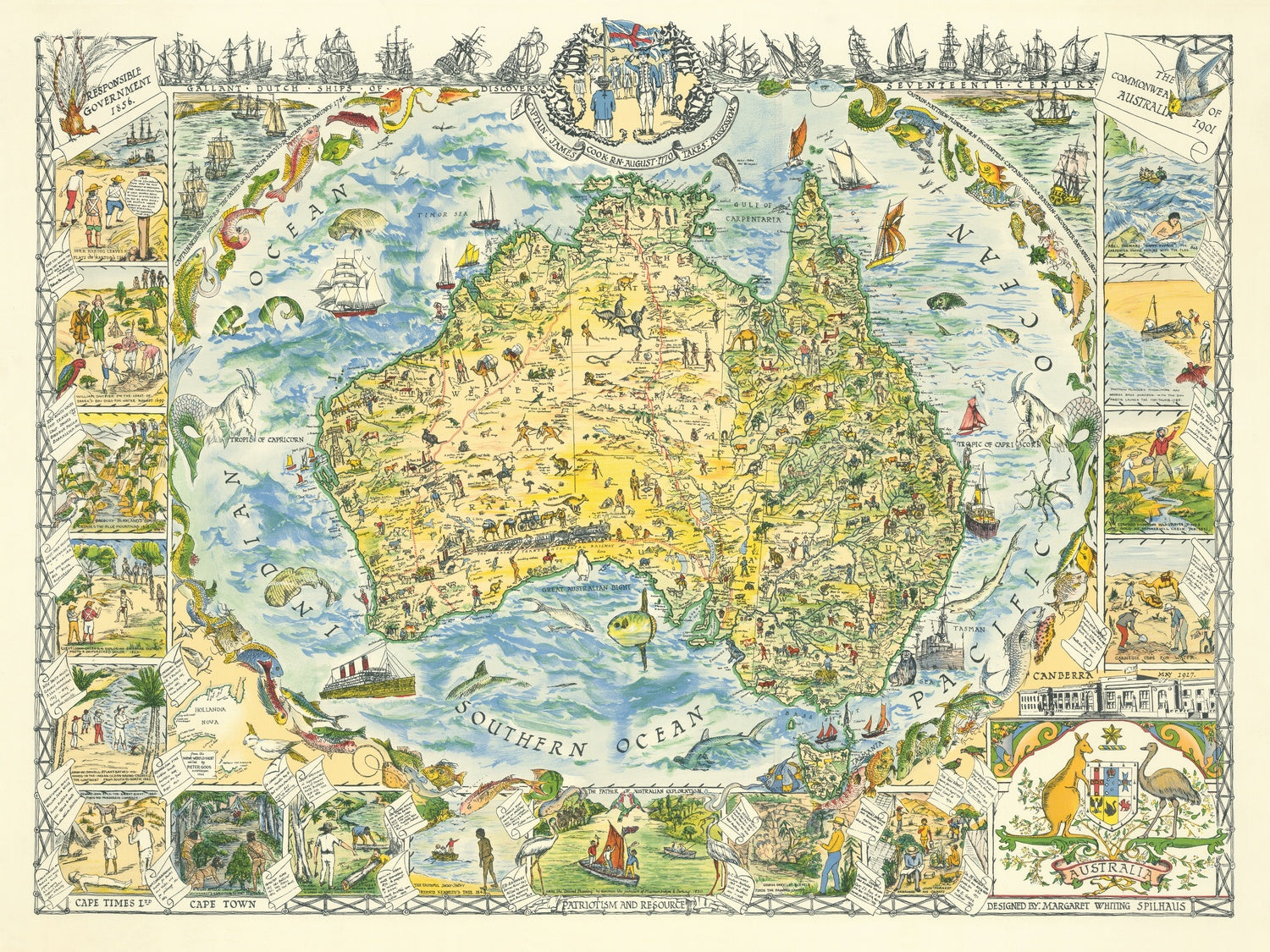 Large Pictorial Map of Australia by Spilhaus, 1929: Captain Cook 1770, Canberra 1927, Sydney, Melbourne, Perth