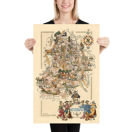 Diese Karte hebt die vielfältigen und faszinierenden Merkmale der Auvergne hervor, von ihren majestätischen Bergen wie dem Puy de Dôme und dem Puy de Sancy bis hin zu ihren historischen Schlössern wie dem Château de Murol und dem Château de Val. Die Einbeziehung dieser Wahrzeichen gibt einen Einblick in die bewegte Vergangenheit der Region, in der natürliche Schönheit und historische Bedeutung miteinander verwoben sind. Die Karte illustriert auch den ländlichen und landwirtschaftlichen Lebensstil der Gegend, mit Darstellungen der einheimischen Bewohner und ihrer traditionellen Aktivitäten, die einen Fensterblick in das tägliche Leben der Auvergne in der Mitte des 20. Jahrhunderts bieten.