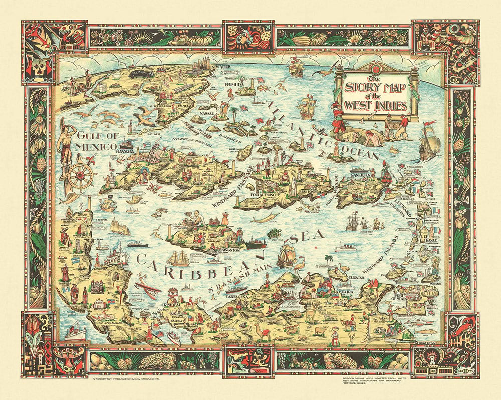 Die Story Map of the West Indies, die 1936 von Colortext Publications Inc. erstellt wurde, ist eine fesselnde Mischung aus Kunst und Kartografie. Diese dekorative Bildkarte fängt das Wesen der Karibik und Floridas anschaulich ein und bietet einen Einblick in die kulturelle und historische Vielfalt der Region. Colortext, bekannt für seine lehrreichen und visuell ansprechenden Karten, verleiht diesem Werk lebendige Illustrationen und komplexe Details, die die Faszination der Ära für Erkundung und Geschichtenerzählen widerspiegeln.
