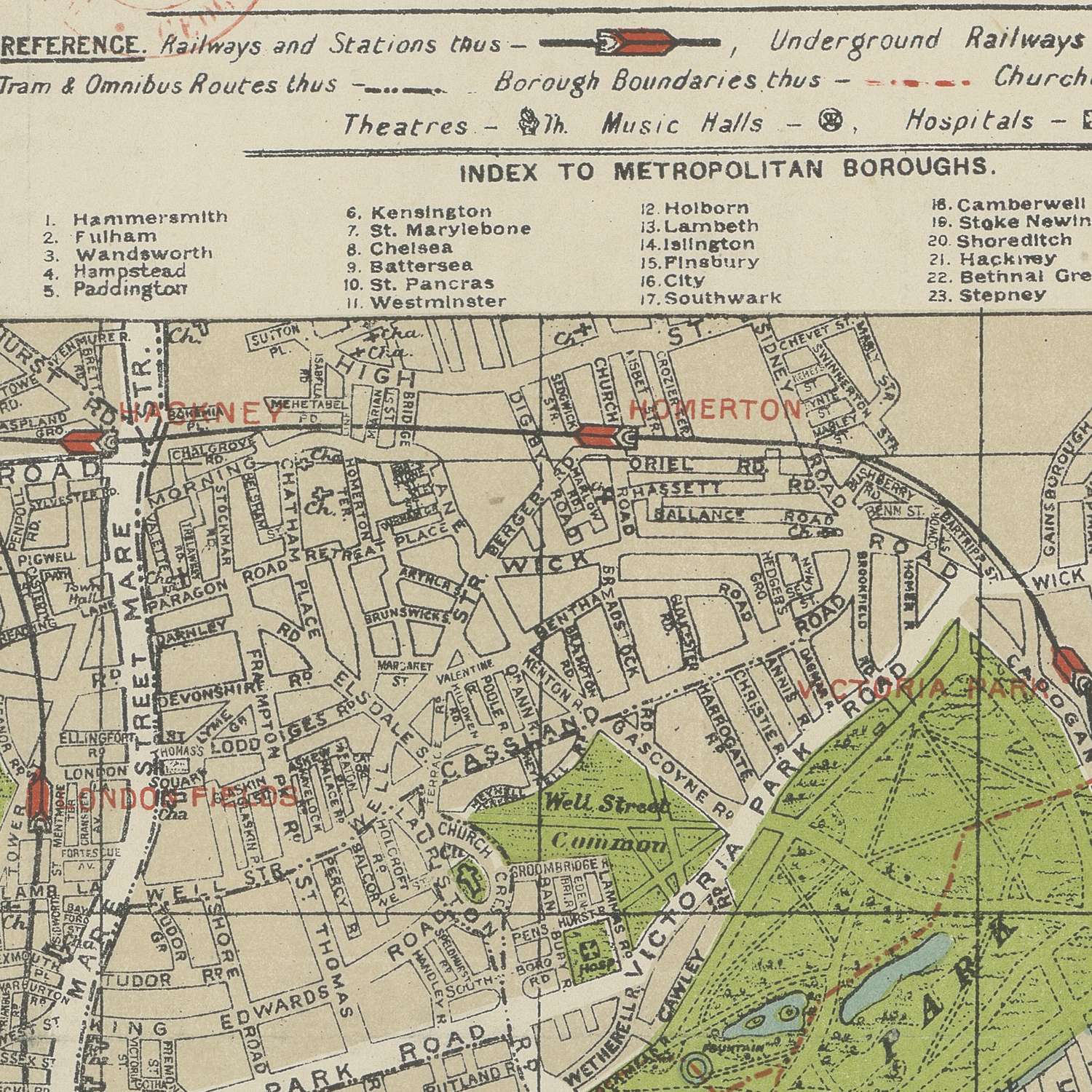 North and northwest of the center, the plan shows the hinge points of Marylebone and Fitzrovia giving way to St John’s Wood and Camden with disciplined exactitude. Baker Street and Great Portland Street trace ordered grids against the green sweep of Regent’s Park, while Edgware Road fans toward the suburbs as a historic arterial. Abbey Road and Camden Road mark residential crescents and industrial belts in transition, and Holloway Road carries the city’s energy into Islington’s rising districts. Railway approaches and stations—so decisive for early 20th-century growth—interlace with tram-era thoroughfares, the grid enabling rapid cross-reference between neighborhoods. The effect is a persuasive image of a city growing northward along well-defined spines, yet still held together by legible, continuous streets.