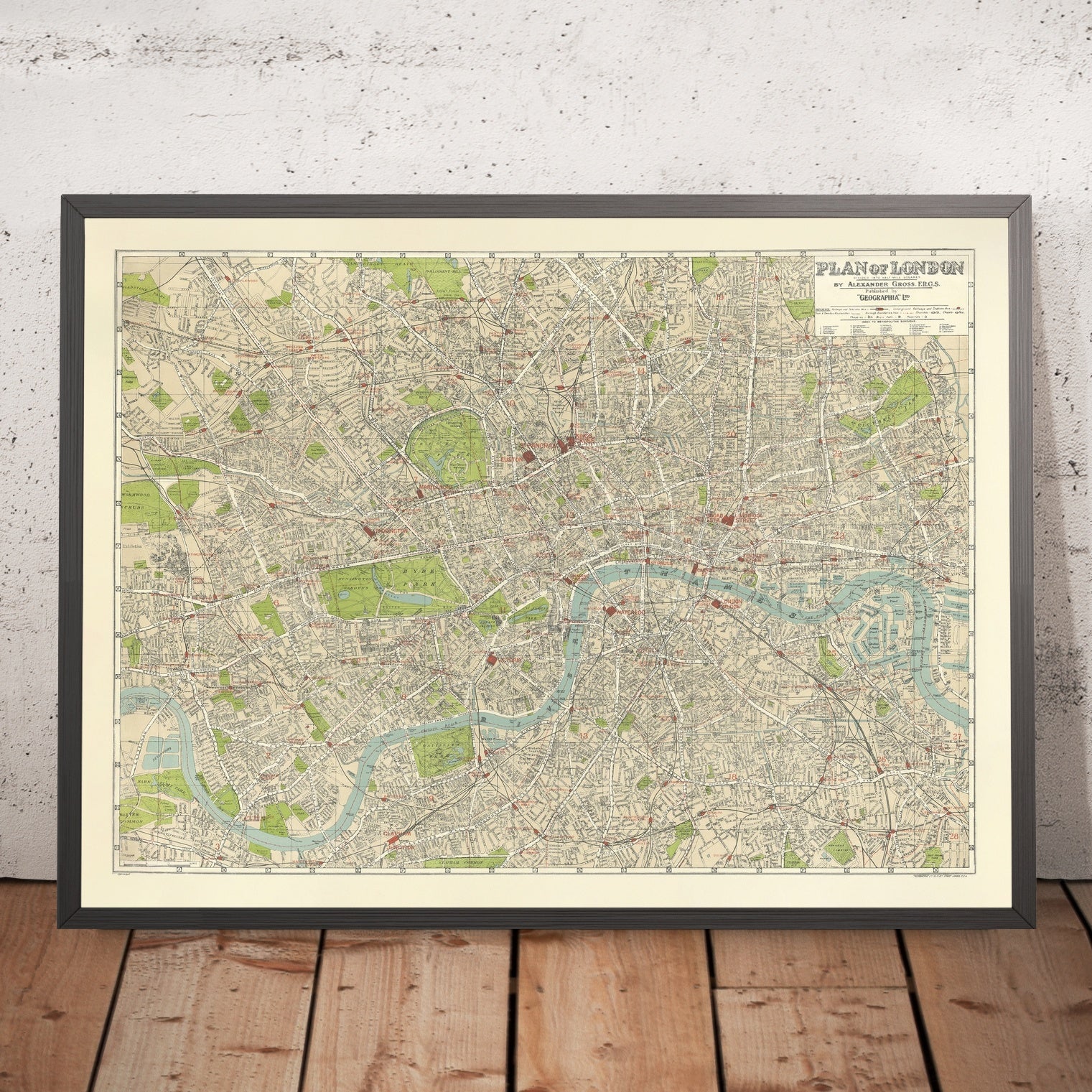 Plan of London by Alexander Gross captures the capital at the pivotal moment of 1920, when the city’s post-war rhythms were returning and its districts were rapidly expanding. Gross’s hallmark half-mile grid brings uncommon clarity to a famously intricate metropolis, turning dense streetscapes into an elegantly navigable schema. The map foregrounds the intertwined themes of urban planning, transportation, and infrastructure, balancing fine-grained street detail with a lucid overview of London’s geography—its parks, bridges, and river bends. Landmarks are crisply identified, and the color system differentiates principal arteries from more modest thoroughfares, guiding residents and visitors alike. As a city map, it is notable for marrying precision with usability at exactly the moment London’s modern age was taking form.