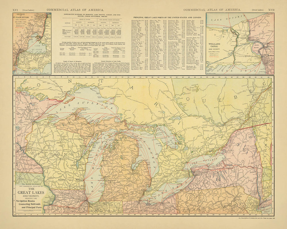 • Extra notes: inset maps highlight the Detroit–St. Clair River area and the Welland Canal, emphasizing key transportation corridors