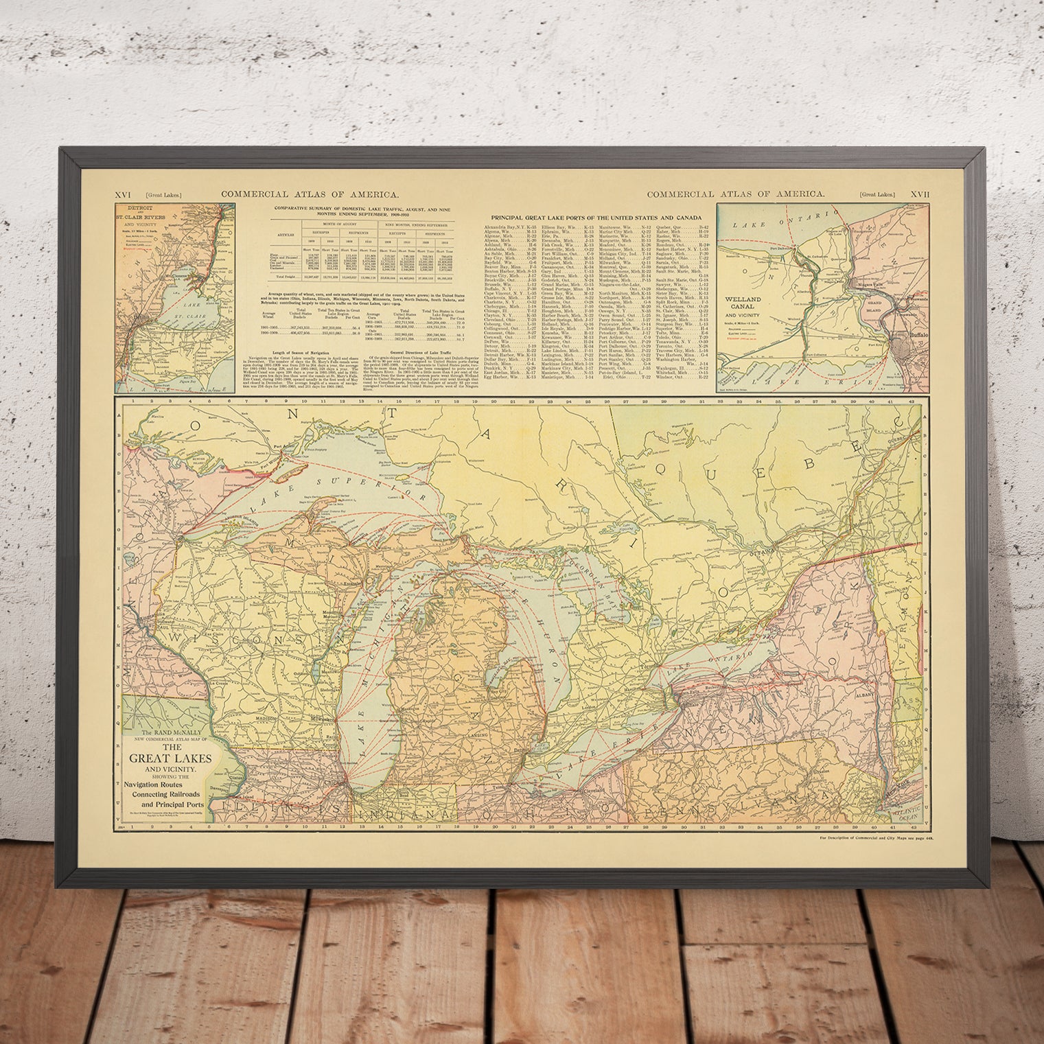 Two inset maps supply the crucial micro-geographies that move macro-economies. Around Detroit and the St. Clair River, the sheet magnifies the narrow straits that carry vessels between Lakes Huron and Erie—past Detroit and Windsor, through Port Huron and Sarnia—where currents, docks, and junctions concentrate traffic and turn time into money. The Welland Canal inset, in turn, highlights the engineered bypass around Niagara Falls, the critical hinge coupling Lakes Erie and Ontario. By isolating these choke points and connectors, Rand McNally underlines how locks, channels, and river reaches determine the cadence of the whole system, and how rail spurs knit back to the lakefront, ensuring that every berth is a gateway to the hinterland.