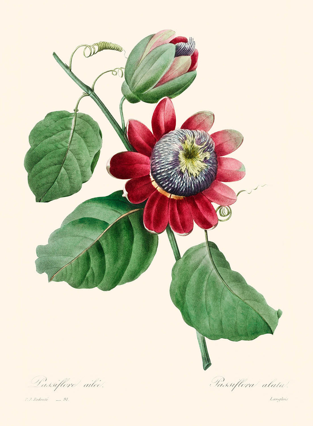 "Passiflore Ailee" sticht nicht nur durch botanische Präzision hervor, sondern auch durch seine künstlerische Komposition. Redoutés Verwendung von Farbe und Detail erweckt die Passionsblume zum Leben und lässt sie fast dreidimensional erscheinen. Das Zusammenspiel von Licht und Schatten sowie die zarten Abstufungen der Blütenblätter zeigen Redoutés außergewöhnliches Talent und seine Leidenschaft für botanische Kunst. Dieses Stück ist nicht nur eine wissenschaftliche Illustration; es ist ein Kunstwerk, das die Schönheit und Eleganz der Natur einfängt.