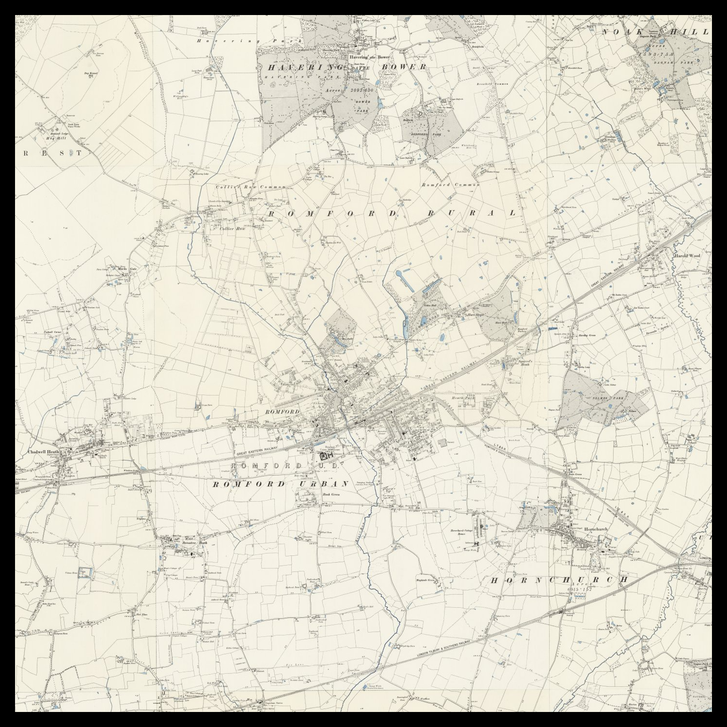 Die Quelle Ihrer Karte sind die illustren Archive des Ordnance Survey, die auf Originalblätter aus den 1870er bis 1960er Jahren zurückgreifen. Die OS-Karten waren bekannt für ihre Präzision, handgezeichneten Details und ansprechende Ästhetik. Vermesser deckten jeden Zentimeter von Havering zu Fuß ab und hielten alles fest, von gewundenen Straßen und Fußwegen bis hin zu Feldgrenzen und Eisenbahnlinien. Das Ergebnis ist eine Karte von unvergleichlichem historischem und visuellem Interesse – eine, die sowohl die großen Veränderungen als auch die subtile Evolution der Landschaft des Stadtteils dokumentiert und sie zu einem perfekten Mittelpunkt für jeden macht, der von der Geschichte Havering fasziniert ist.