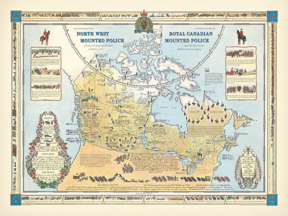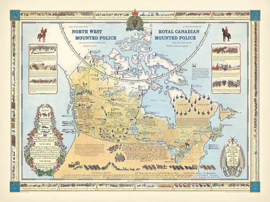 Die Karte feiert auch die Siedlungen, Forts und Handelsplätze, die eine entscheidende Rolle in der Geschichte Kanadas spielten. Von großen Städten wie Toronto, Vancouver und Calgary bis hin zu historischen Außenposten wie Fort Macleod, Fort Garry und Fort Edmonton verfolgt die Karte den Bogen der Besiedlung und die Ausbreitung der Zivilisation über den Kontinent. Dekorative Kartuschen, maritime und luftfahrttechnische Abteilungen sowie eine Vielzahl anderer zeitgenössischer Details bereichern das visuelle Erlebnis und machen diese Karte nicht nur zu einem wertvollen historischen Dokument, sondern auch zu einem Kunstwerk, das die epische Saga der Royal Canadian Mounted Police zum Leben erweckt.