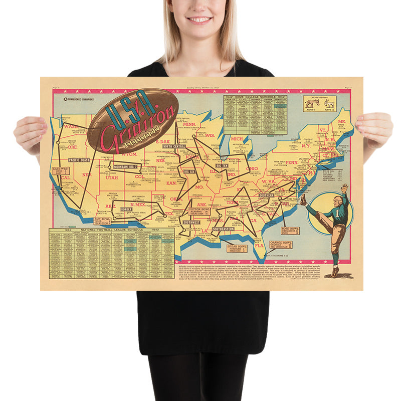 Betreten Sie die dynamische Welt des amerikanischen Sports der Mitte des 20. Jahrhunderts mit "U.S.A. Gridiron", einer exuberanten bildlichen Karte, die 1942 von Edwin L. Sundberg erstellt wurde. Beauftragt von der Sunday News aus New York City, bietet diese Karte ein lebendiges Tableau der Nation in einem entscheidenden Moment der Geschichte. Mit ihrem farbenfrohen Mittelfaltendesign fängt "U.S.A. Gridiron" den Geist des College-Footballs während des Zweiten Weltkriegs ein und präsentiert eine „Tribünenansicht des amerikanischen College-Football-Bildes.“ Das komplexe Netzwerk schwarzer Linien der Karte verbindet die führenden College-Football-Teams des Landes, während nummerierte Kästchen akribisch ihre Aufzeichnungen dokumentieren und die Betrachter einladen, die Rivalitäten und Triumphe nachzuvollziehen, die die Saison 1942 prägten.