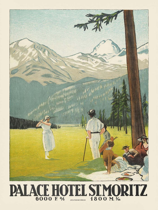 Palace Hotel. St. Moritz by Emil Cardinaux (1921) invites you into the rarefied calm of Switzerland’s Engadin valley at the dawn of modern leisure travel. A leading light of early Swiss poster art, Cardinaux distills the glamour of St. Moritz into a tranquil tableau: elegantly dressed visitors in bright whites enjoy the alpine air while, beyond them, blue lake waters, deep-green pines, and pale mountain peaks recede into the distance. Created in the post–World War I boom for grand hotels and European resort culture, the work captures the effortless sophistication that made St. Moritz an international byword for style.