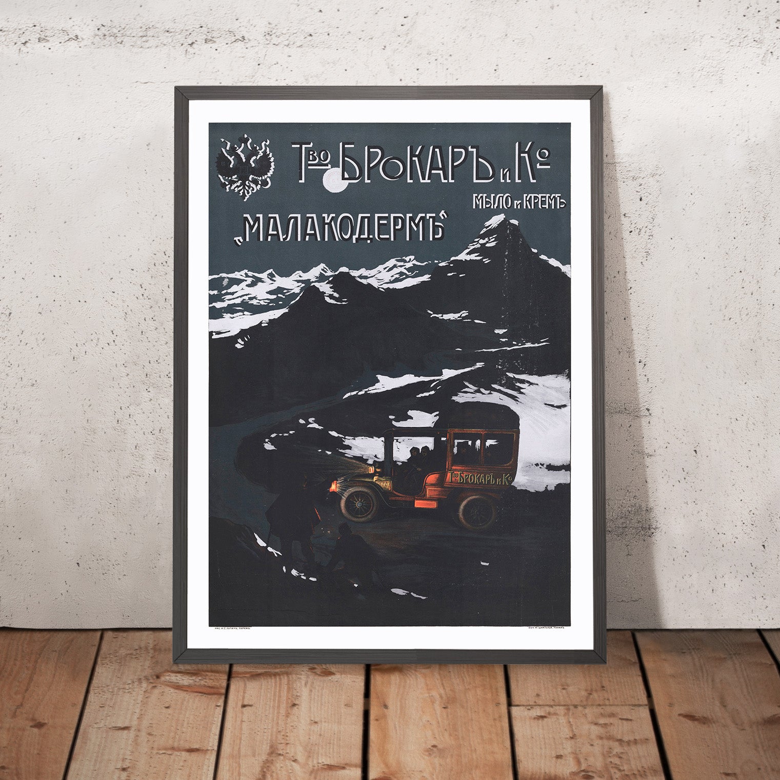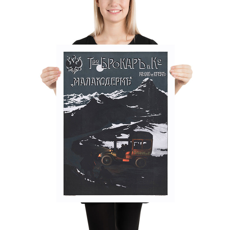 Louis Tauzin’s 1909 Entreprise Brokar & Cie – Savon et crème – ‘Malakoderm’ is a dramatic Belle Époque advertising poster with the soul of a travel scene. In moonlit blues and inky blacks, a jagged Alpine peak rises above a serpentine mountain road as a red touring car rounds the bend—its headlamps throwing a warm cone of light onto two shadowy figures at the roadside. Cyrillic lettering and the double‑headed imperial eagle identify the Russian perfumery Brokar & Co., while the product name “Малакодермъ” (Malakoderm—literally “soft skin”) glows across the night sky. The setting, with its unmistakably pyramidal summit, closely recalls the Matterhorn above Zermatt, evoking the romance of early travel in the high Alps.