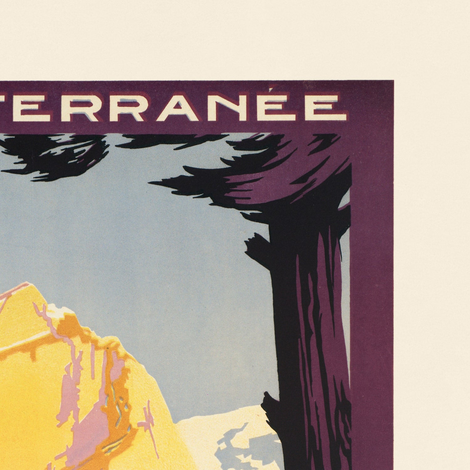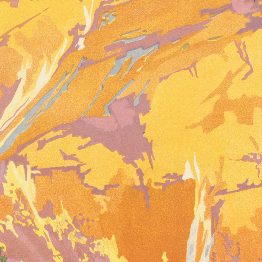 Design lovers will appreciate the sophisticated color story: saffron and amber rock faces cut with cool purple shadow; deep green pastures stitched with pale roads and a river; and the near‑black trunks that act like theater curtains, heightening the sense of discovery. The contrast of yellow, purple, and green gives the piece a modern snap while keeping the warmth of vintage lithography—perfect for bringing alpine light into living rooms, studies, and chalets alike.