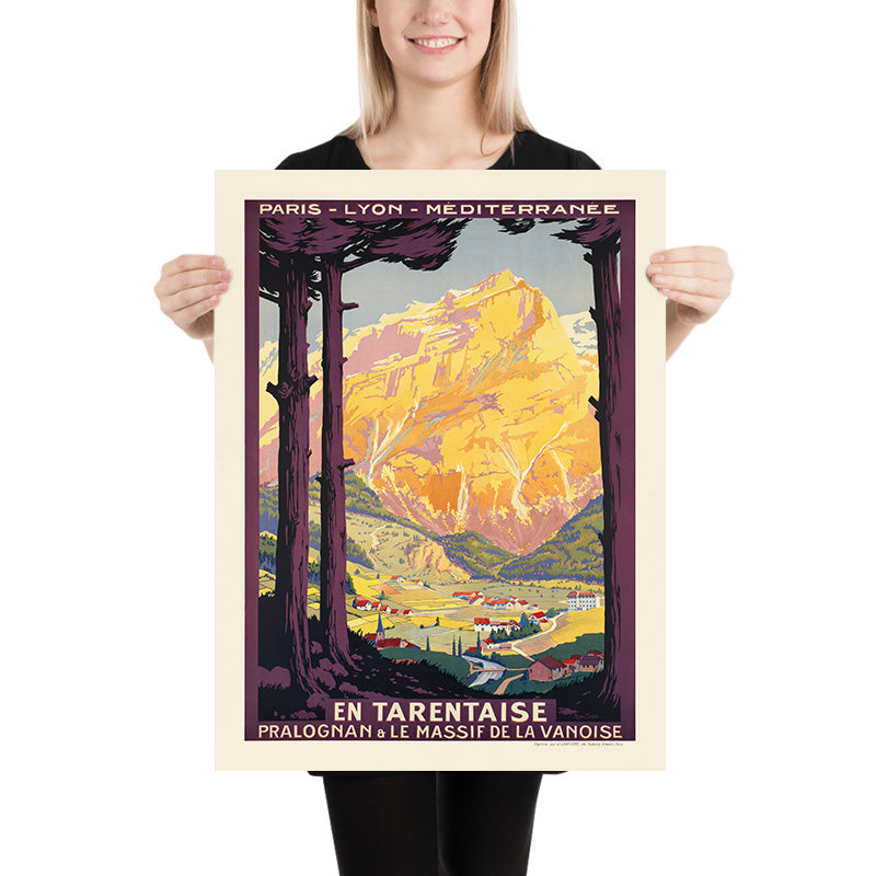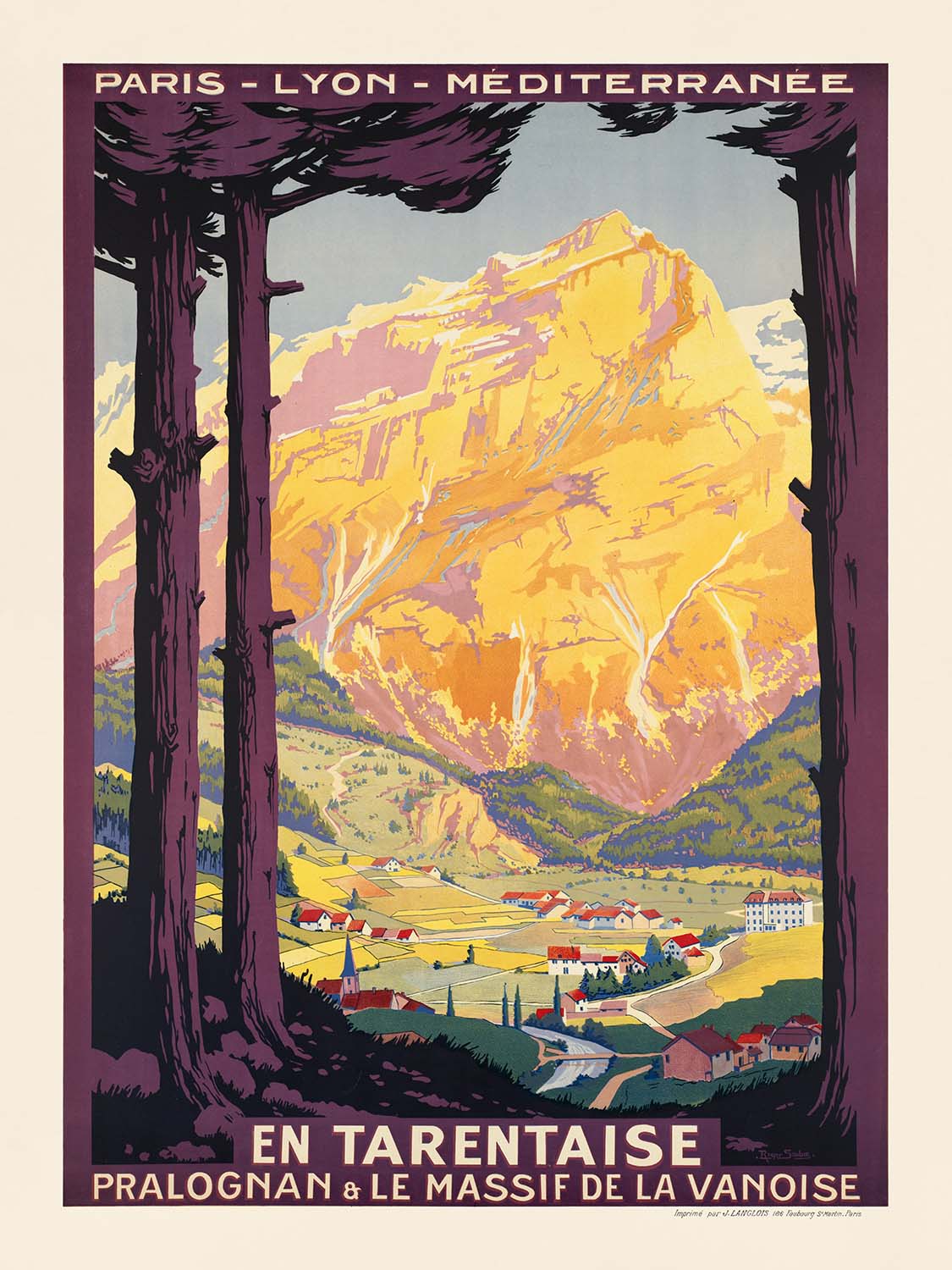 En Tarentaise. Pralognan & le Massif de la Vanoise by Roger Soubie invites you straight into the sunlit heart of the French Alps. Commissioned in the golden age of railway tourism, this classic French poster celebrates the Tarentaise Valley in Savoie—gateway to the Vanoise range and the village of Pralognan-la-Vanoise. Soubie frames the scene with tall, inky pines at left and right, opening onto a valley of neat chalets and a river, all set beneath a dramatic wall of glowing alpine rock. The mountain is painted in radiant yellows with lavender shadows, a visual cue for high, crystalline light that travelers know so well.