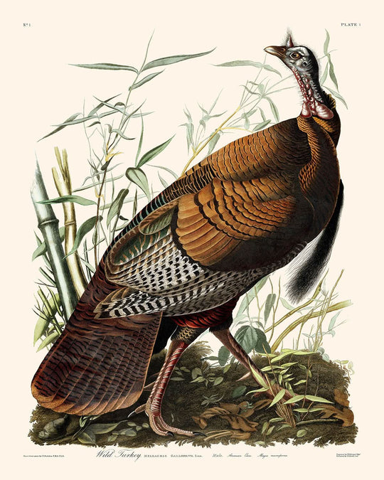 John James Audubons "Wild Turkey" aus dem Jahr 1827 ist eine klassische Darstellung der amerikanischen Tierwelt, die die Pracht eines der majestätischsten Vögel, die in den Vereinigten Staaten heimisch sind, einfängt. Die Wild Turkey-Illustration, die erstmals in "The Birds of America" veröffentlicht wurde, zeigt Audubons bemerkenswerte Liebe zum Detail und seine Fähigkeit, die natürliche Schönheit und die lebensechte Präsenz des Vogels in seinem natürlichen Lebensraum darzustellen.